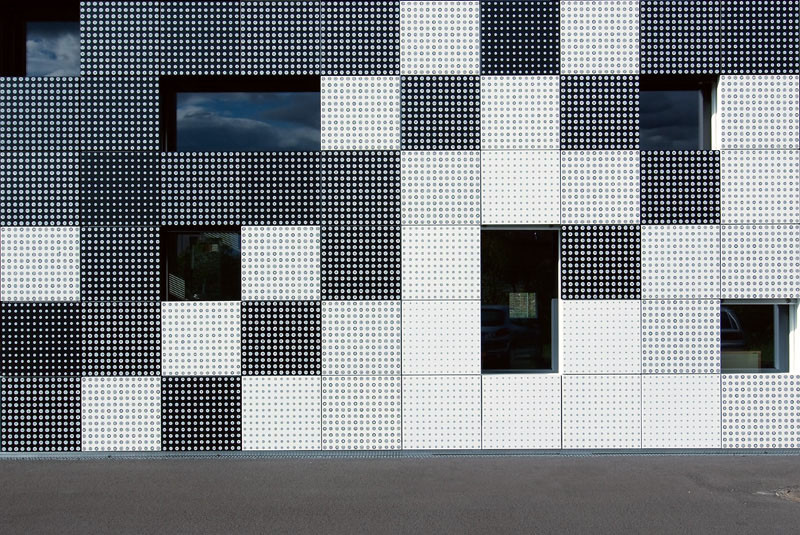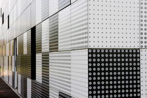 Jeanne Gang’in Aqua Tower ‘ın cephesinde yakından ve uzaktan görünümün farklı olduğu gibi bu örnekte de neredeyse kare olan (67 x 71,5 cm) alüminyum paneller belli bir mesafeden görüldüğü gibi yalnızca grinin bir tonu değil. Her kare bir araya geldiğinde tek bir ton oluşturan farklı imajlar içeren serigrafiler. Pencere açıklıkları ise binaya ulaşana kadar göremeyeceğiniz şekilde saklanmış durumda.