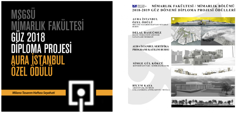 2018 Güz Dönemi MSGSÜ Mimarlık Bölümü Diploma Projeleri arasından Delal Başeğmez ‘Haliç Tersanesi Gösteri Sanatları Merkezi’ projesiyle AURA İstanbul Özel Ödülü “Milano Tasarım Haftası Seyahat Bursu” ödülüne layık bulundu.