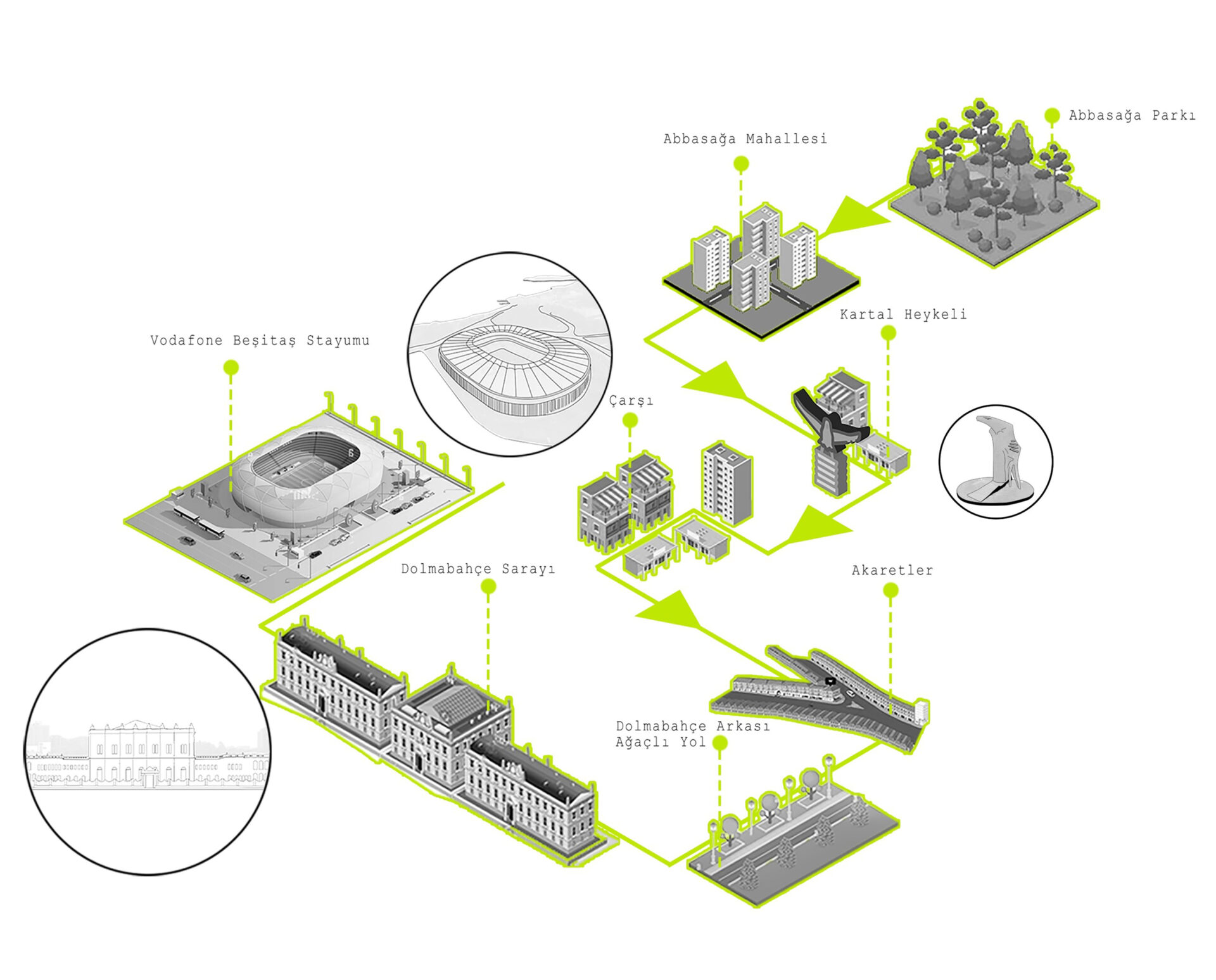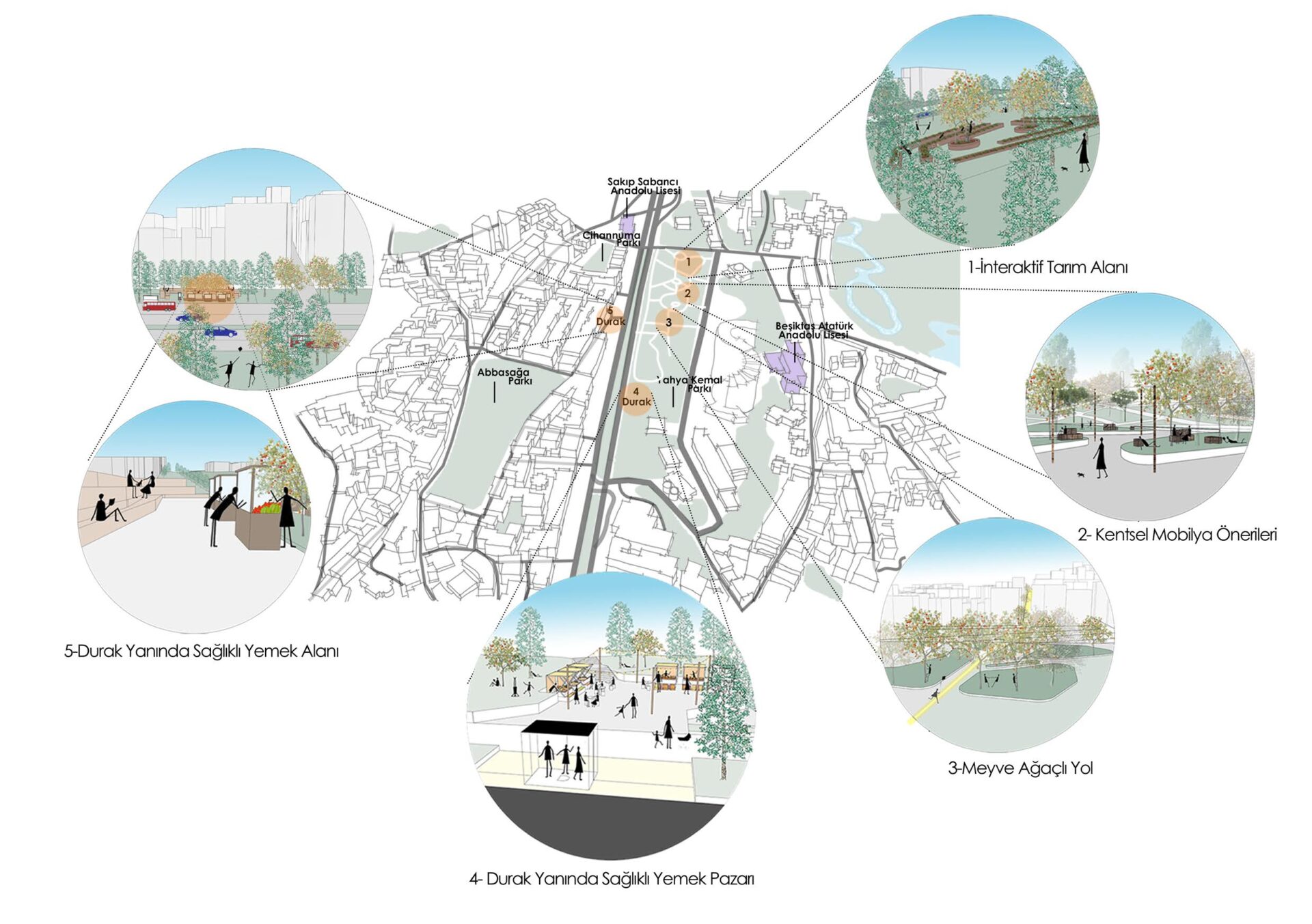 Beşiktaş’ı kent hafızasında kimlik verememesi sorunu üzerine, esenlik ve meydan kavramları bağlantısının hissiyatını güçlendirmek amaçlanmıştır. Bu bağlantı, Dolmabahçe ve Çırağan Sarayı’ndan gelen ağaçlı yol dokusunu sürdürerek sağlanmıştır. Bunun için meydan ve çevresindeki Bahçeşehir Üniversitesi ve Shangri-La Bosphorus otelin yıkılması odaklı ağaçlı yolla bütünsel yeni meydan önerisi sunulmuştur.