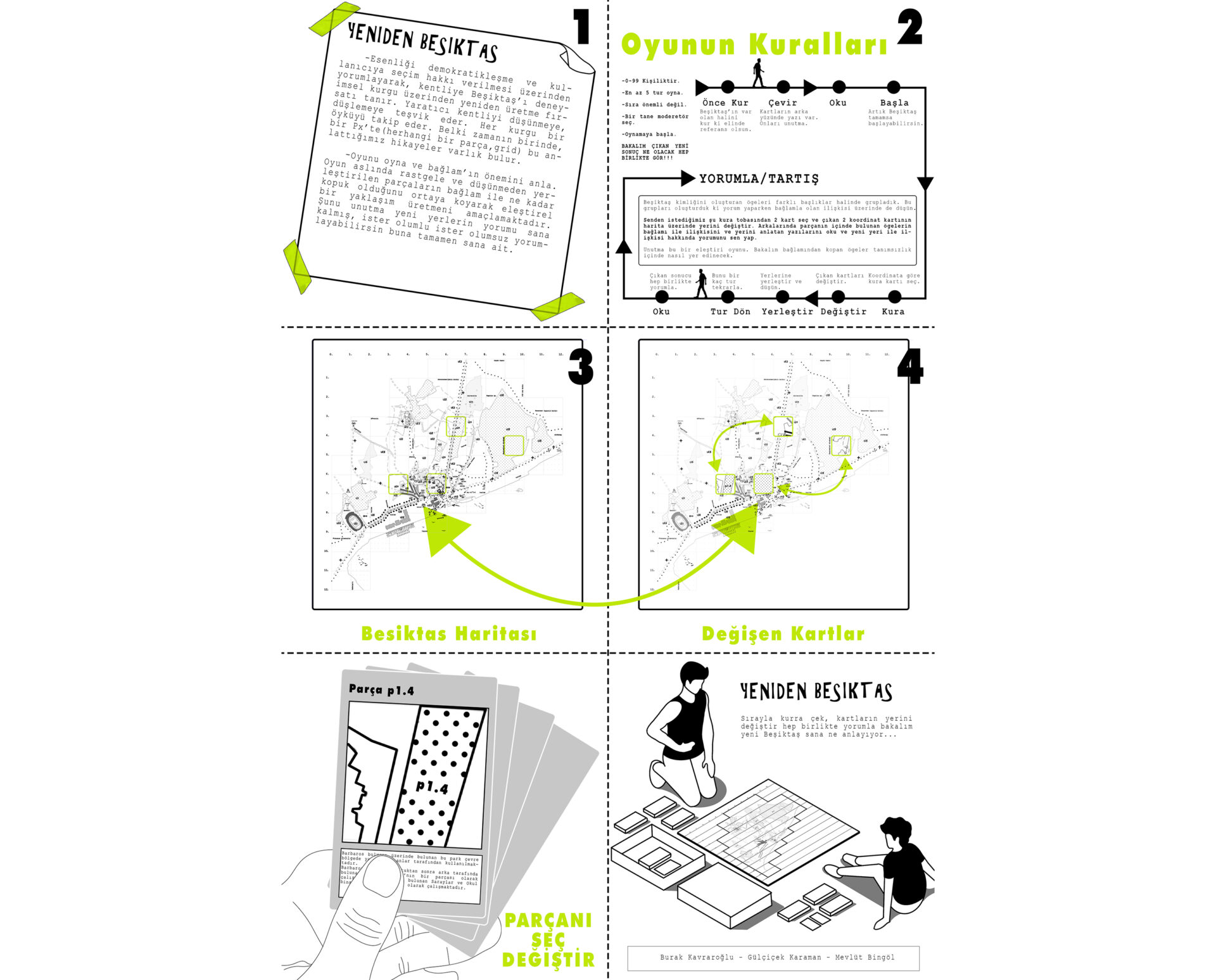 Esenliği demokratikleşme ve kullanıcıya seçim hakkı verilmesi üzerindenyorumlayarak, kentliye Beşiktaş’ı deneyimsel kurgu üzerinden yeniden üretme fırsatı tanır. Yaratıcı kentliyi düşünmeye, düşlemeye teşvik eder. Her kurgu bir öyküyü takip eder. Belki zamanın birinde bir Px’te (herhangi bir parça, grid) bu anlattığımız hikayeler varlık bulur.
