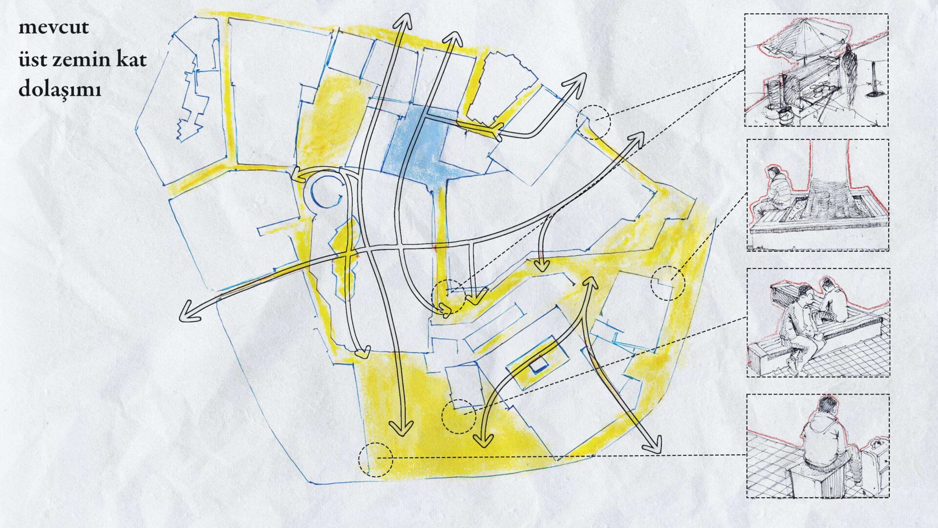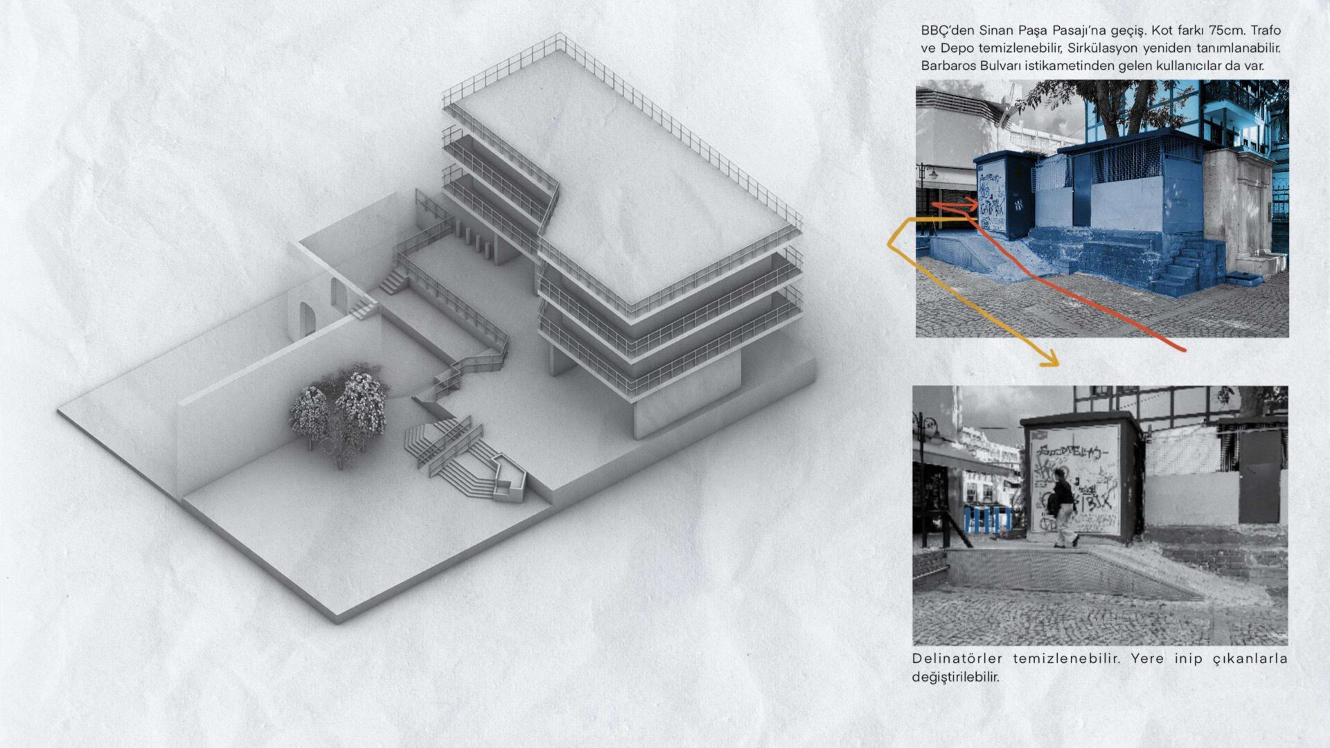 Saha gezileriyle tanımaya çalıştığımız Beşiktaş Çarşı ve çevre yapılarının görünürlüğüne dair problemleri çeşitlendirmek amaçlanmıştır. Çözüm önerisi olarak çarşı kitlesi ile sirkülasyon arası ilişkiyi iyileştirmek amacıyla temizleme önerilmiştir.