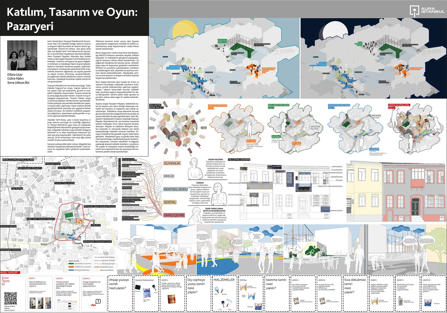 Katılımcı süreçlerle tasarlanan projede, odaklardaki karşılaşma ve buluşmalar gözetilerek birlik ve beraberlik ortamının sağlanması, bu sayede güvenlik ve aidiyet hissinin arttırılması amaçlanmaktadır. Bu bağlamda mahalle sakinlerinin tasarım sürecine katılması, mahalleyle kurdukları ilişkide önemli bir rol oynamaktadır. Pazaryeri Mahallesi’nin de içinde bulunduğu “Sakin Mahalle Programı”nın amacı, toplum katılımı ile her yaştan insan için tasarlanmış, güvenli ve erişilebilir mahalleler oluşturmaktır. Tasarım önerisi de bu amaç doğrultusunda “Katılım, Tasarım ve Oyun” başlığıyla kurgulanmıştır. Tasarım, fiziksel, sosyal ve kamusal başlıkları altında öneriler içermektedir. Fiziksel yaklaşım çerçevesinde alandaki tüm yapıların hasar analizi yapılmıştır. Hasar analizine yönelik gerçekleştirilecek onarımlar için uygulama kartları oluşturulmuştur. Bu kartların mahallede yaşayanlara dağıtılması; çalışmaların profesyoneller ve yerel ile yapılması planlanmaktadır. Alandaki Tarih Rotası, yola iz olarak boyanmış ve proje alanının çevresiyle de sürekliliği sağlanmıştır. Rotaya eklemlenen yaya rotası ise meydanları bütünleştirerek alternatif bir güzergah oluşturmaktadır. Bölgedeki sokakların yaya öncelikli olduğunu belirtmek ve ısı adası oluşumunun önlenmesi için alan açık griye boyanacaktır. Sakinleştirici bir yönü olan gri, iyi bir tamamlayıcı renk olup diğer parlak renkleri ön plana çıkarmaktadır. Kamusal yaklaşımdaki odak noktası, bölgedeki boş alanların meydanlara dönüştürülmesidir. Esnek tasarım ile meydanlar farklı şekillerde kullanılabilecektir. Mekansal tasarımın temel unsuru olan boyama çalışmalarının etaplanarak mahalleli ile birlikte tamamlanması, proje kapsamında bir model önerisi olarak tasarlanmıştır. Birinci etapta İzmir Tarihi Liman Kenti Alan Başkanlığı UNESCO binasının önündeki meydan, kültürel faaliyetler ve mahallelinin görüşlerini paylaşabileceği bir buluşma noktası olarak tasarlanmıştır. Bu bağlamda meydanda atıl bulunan duvar, silinebilir beyaz boya ile boyanarak gündüzleri mahallelinin fikirlerini ve sorunlarını yazabilecekleri, standların kurulabileceği bir alan, akşamları ise açık hava sineması olarak kullanılabilecektir. Meydandaki zeminin oturma düzenini ve dolaşımı destekler biçimde boyanması planlanmıştır.