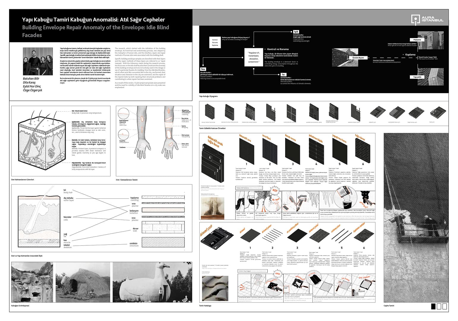Çalışma kapsamında, yapı kabuğunun tanımı, tarihsel ve evrimsel süreci ve tamir yöntemleri araştırılmaktadır. Araştırma, insan derisi metaforuyla şekillenmiş olup insan derisinin katmanları ve tamir yöntemleri, yapı kabuğunun katmanları ve tamir yöntemiyle ilişkilendirilmiştir. Spesifik yapı kabuğu örnekleri, katmanlarıyla birlikte tanımlanmış ve bu katmanların tamir yöntemleri “tamir kılavuzları” olarak ifade edilmiştir.