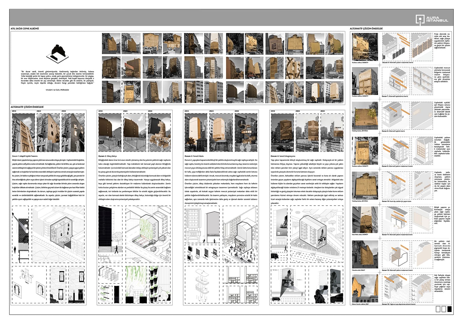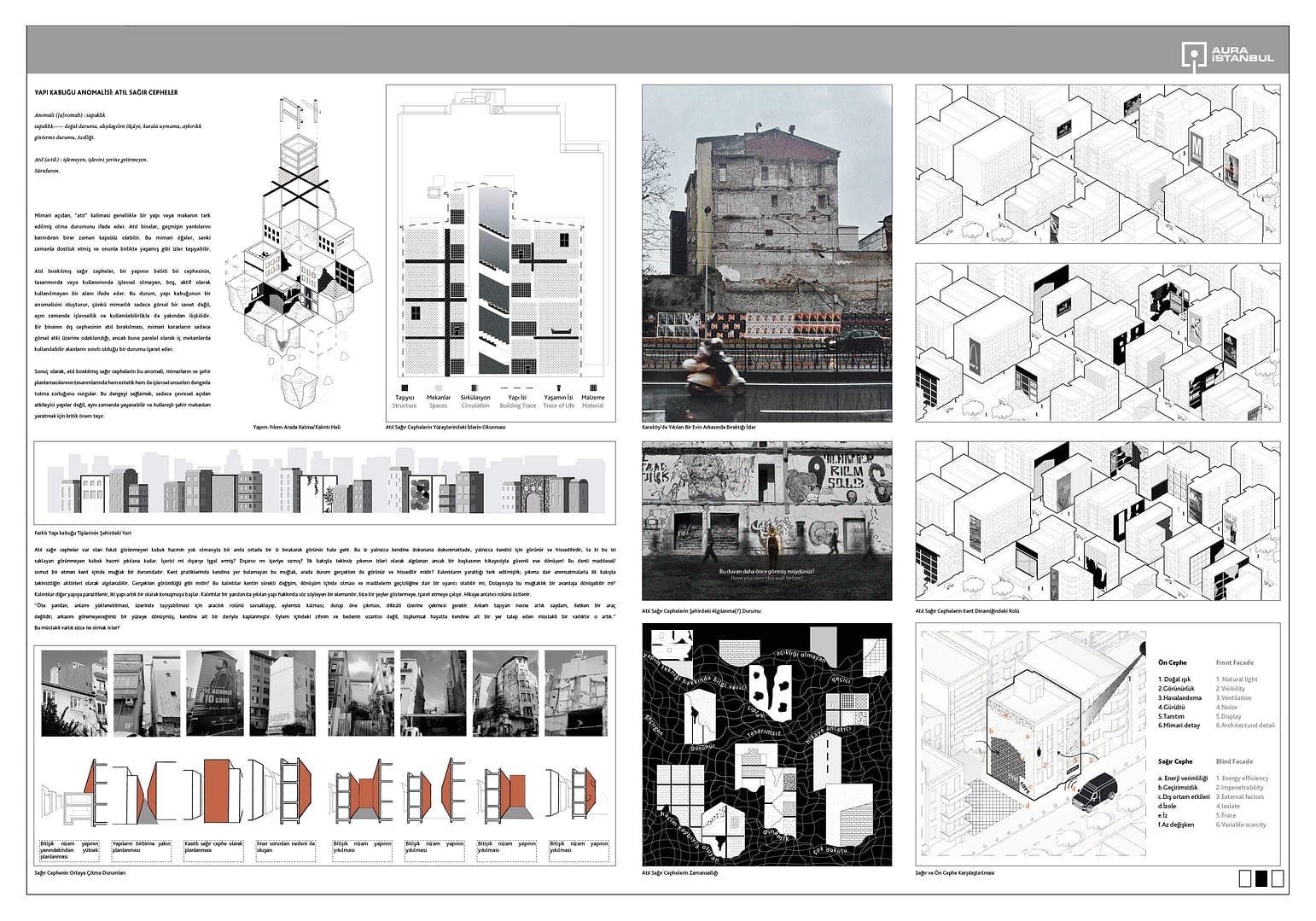 Araştırma sürecinde yapılan çıkarımlarla birlikte sağır cephelere odaklanılmıştır. Ölü deri gibi görülen sağır cephelerin nasıl oluştuğu, kent içindeki durumları, potansiyelleri ve problemleri araştırılmakta ve sonuç olarak kent içindeki sağır cephelerin potansiyel durumlarına göre adapte olabilecek bir sistem önerisi sunulmaktadır.