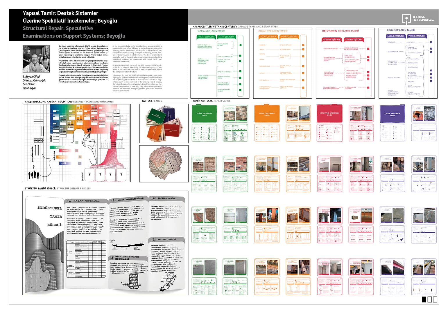 Çalışmada 4 farklı yapısal sistem kategorisi üzerinden inceleme yapılmış; Yığma, Ahşap, Betonarme ve Çelik Yapılarda Tamir başlıkları çerçevesinde geliştirilmiştir. Söz konusu yapısal sistemlerin her biri üzerinden yapısal tamirin çeşitleri incelenmiş ve uygulanma süreçleri “Tamir Kartları” formatında hazırlanan el kartları ile temsil edilmiştir.