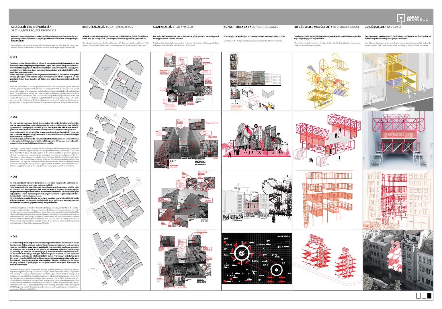 Proje önerisi olarak İstanbul ilinin Beyoğlu ilçesi kısmen ele alınarak bitişik nizam yapı dizgesinde yıkım sonrası oluşan yapı boşluğunda yer alan taşıyıcı destek elemanları irdelenmiştir. Yapılan alan gezisi sonrası iki bina arası geçici taşıyıcı destek sistemlerinin modüler olmaması ve yerinde tekil çözümler olması eleştirilmiş ve geliştirilmesi planlanan önemli bir girdi olduğu anlaşılmıştır. Proje sürecinin devamında bu tipolojiye sahip alanların değerinin yüksek olması, kent içine getirdiği tekinsizlik halinin bulunması gibi faktörler de incelenerek çeşitli durumlar için spekülatif senaryoların üretilmesi hedeflenmektedir.