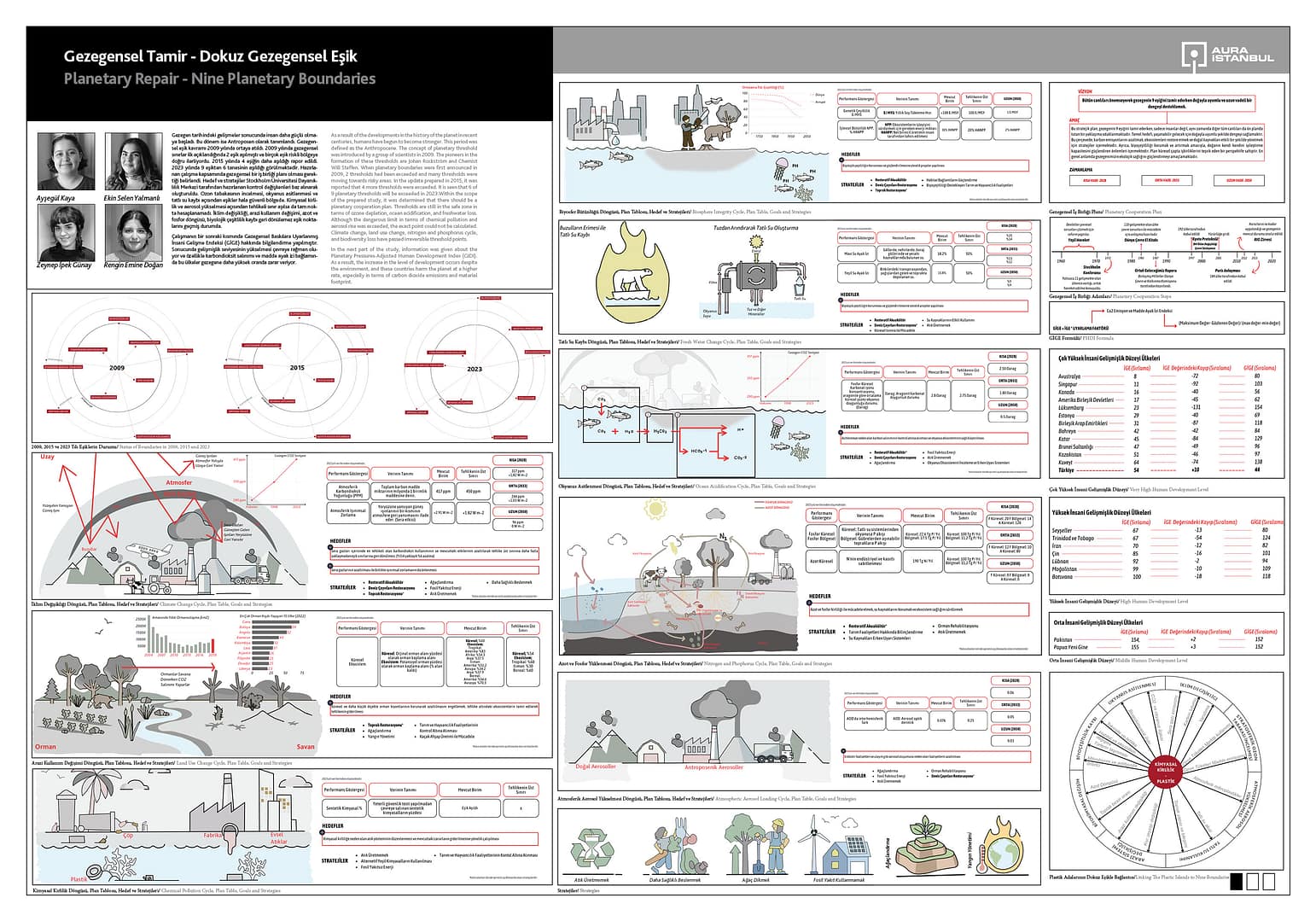 Çalışmanın çerçevesini Stockholm Üniversitesi ve araştırmacıları tarafından geliştirilmiş, “Gezegensel 9 Eşik” kavramı oluşturuyor. Dünyanın her bir yanından toprak-su-hava-uzay kirliliği ve bozulmalarına yönelik hikayelerin derlendiği çalışma, insan ve sermaye eliyle gerçekleşen tamirlerin de yeni sorunlara yol açtığını veya zaten gezegensel çözüme odaklı yaklaşılmadığını söylüyor. Bu onarım önerileriyle Gezegensel Tamir’in bu sistem içinde çok da mümkün olmadığı kanısına varırken yalnızca sorun ve tamirlerden oluşan yumağın karmaşıklaşmasına giden yol inceleniyor. İnsan eylemlerinin gezegenin sınırlarını ne kadar zorladığına odaklanılıyor.