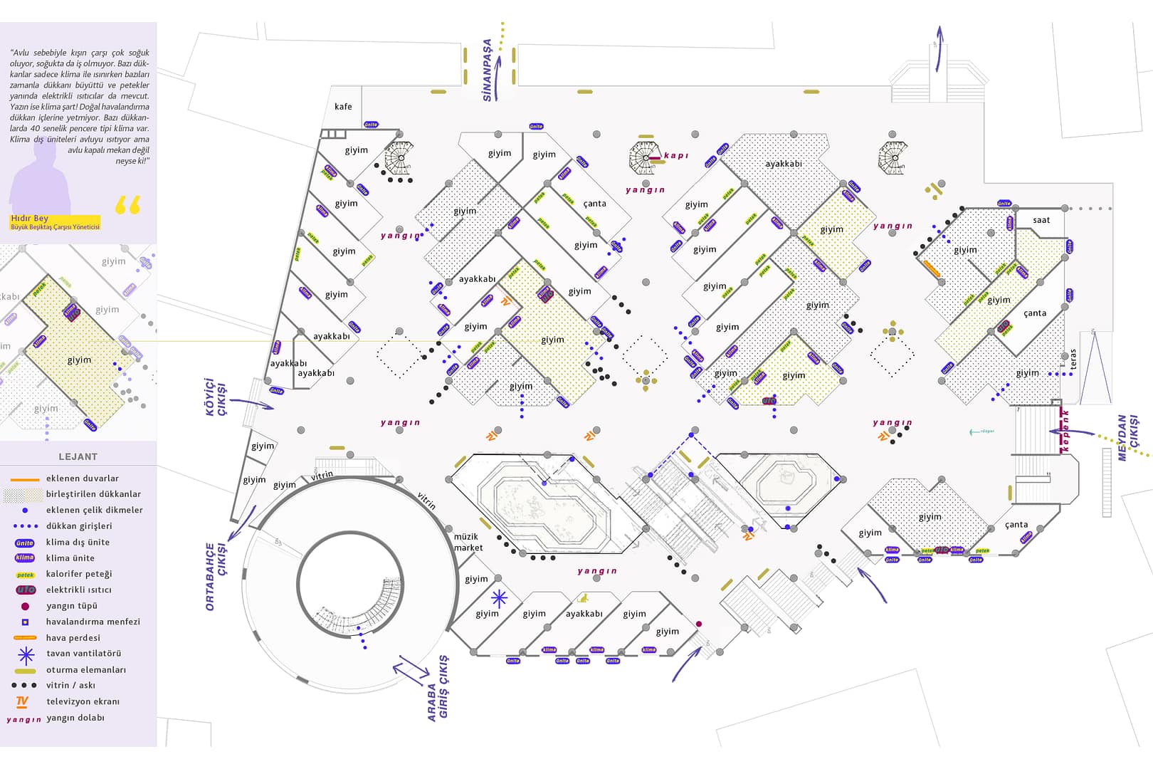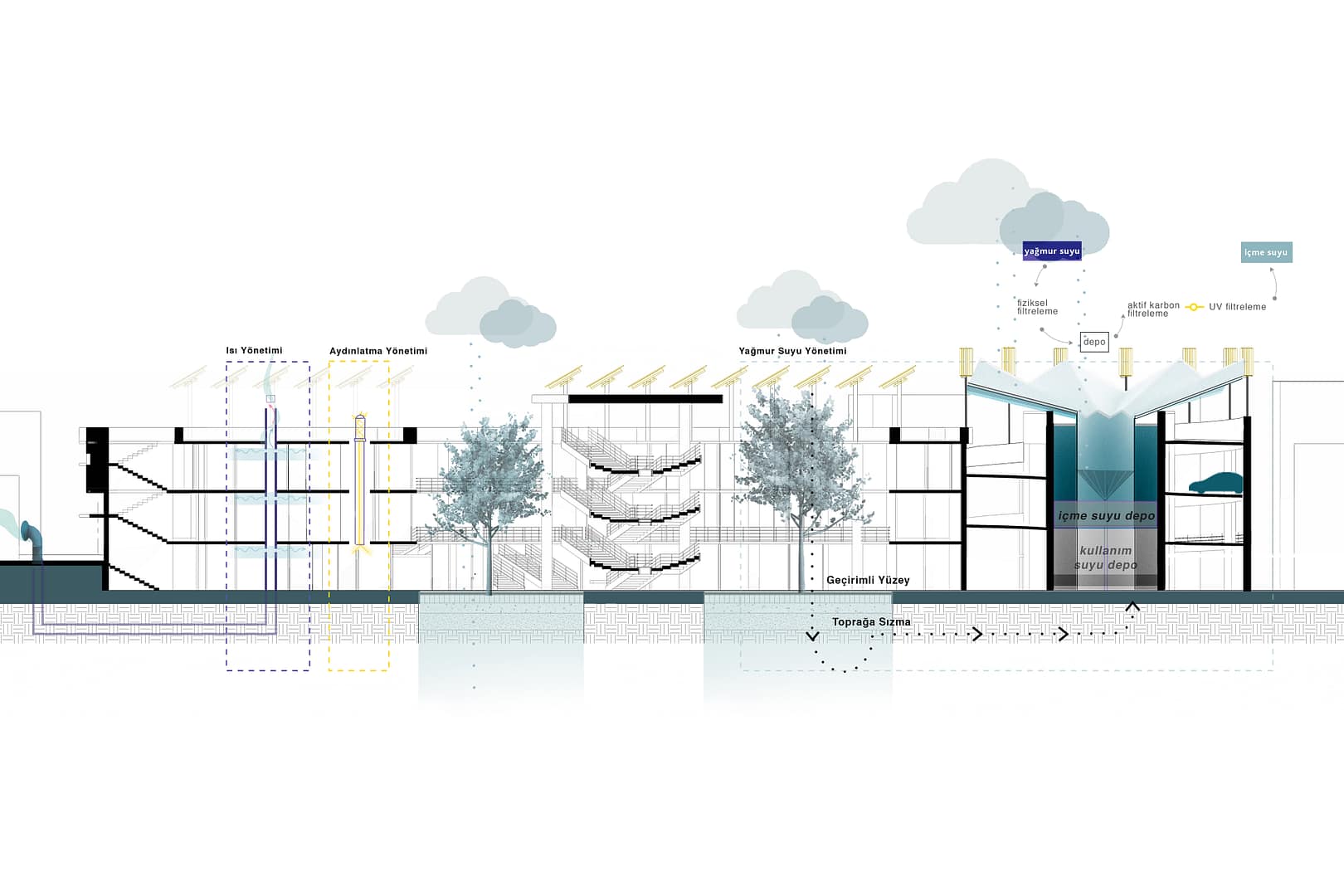 Proje sürecinde, yapıdaki mevcut altyapısal sistemlerin tespiti ve analizi yapılarak yapıya hangi önerilerin uygun olduğu sorgulanmış; ağ yapısal yeni sistemler önerilmiştir. Büyük Beşiktaş Çarşısı’nın sahip olduğu özgün nitelikler göz önünde bulundurulduğunda en uygun sistemlerin pasif sistemler olduğuna karar verilmiş, Isı, Elektrik/Aydınlatma ve Su Yönetimi başlıklarında proje için önerilmiştir. Yapıya entegre edilen bu sistemlerle; sorunlu olan ısıtma, havalandırma, aydınlatma gibi altyapıların restorasyonu yapılarak sadece günümüzde değil, gelecekte de gelişen teknolojilerle birlikte evrilmeye devam eden bir ‘ağ yapı’ oluşturulması öngörülmüştür.