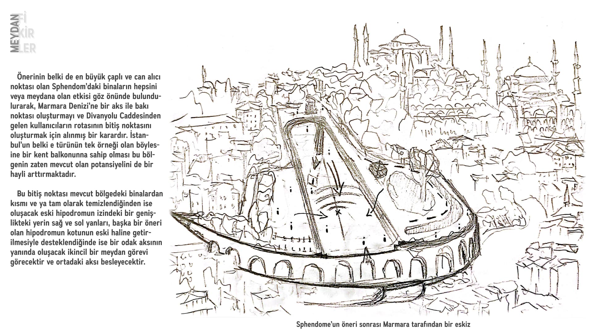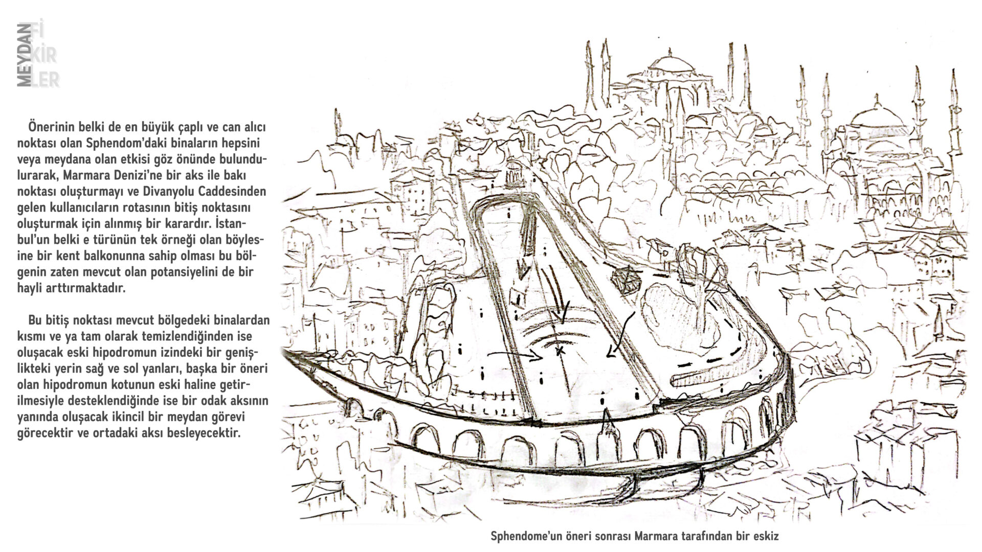 Bu çalışmada Hipodrom ’un sonundaki nokta olan Sfendon olarak bilinen kıymetli alanı, dünyada belki de türünün tek örneği olan bir yapının Sultanahmet Meydanı, Divanyolu ve hatta bütün İstanbul’la potansiyel olarak kurabileceği ilişkiyi ele alınmıştır.