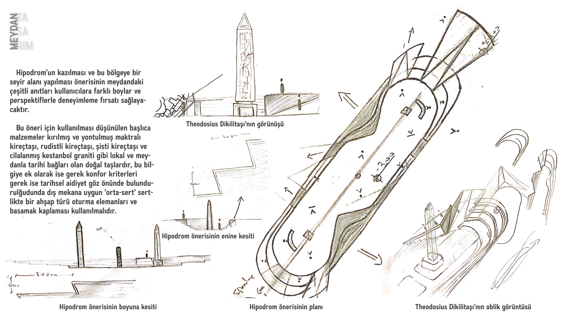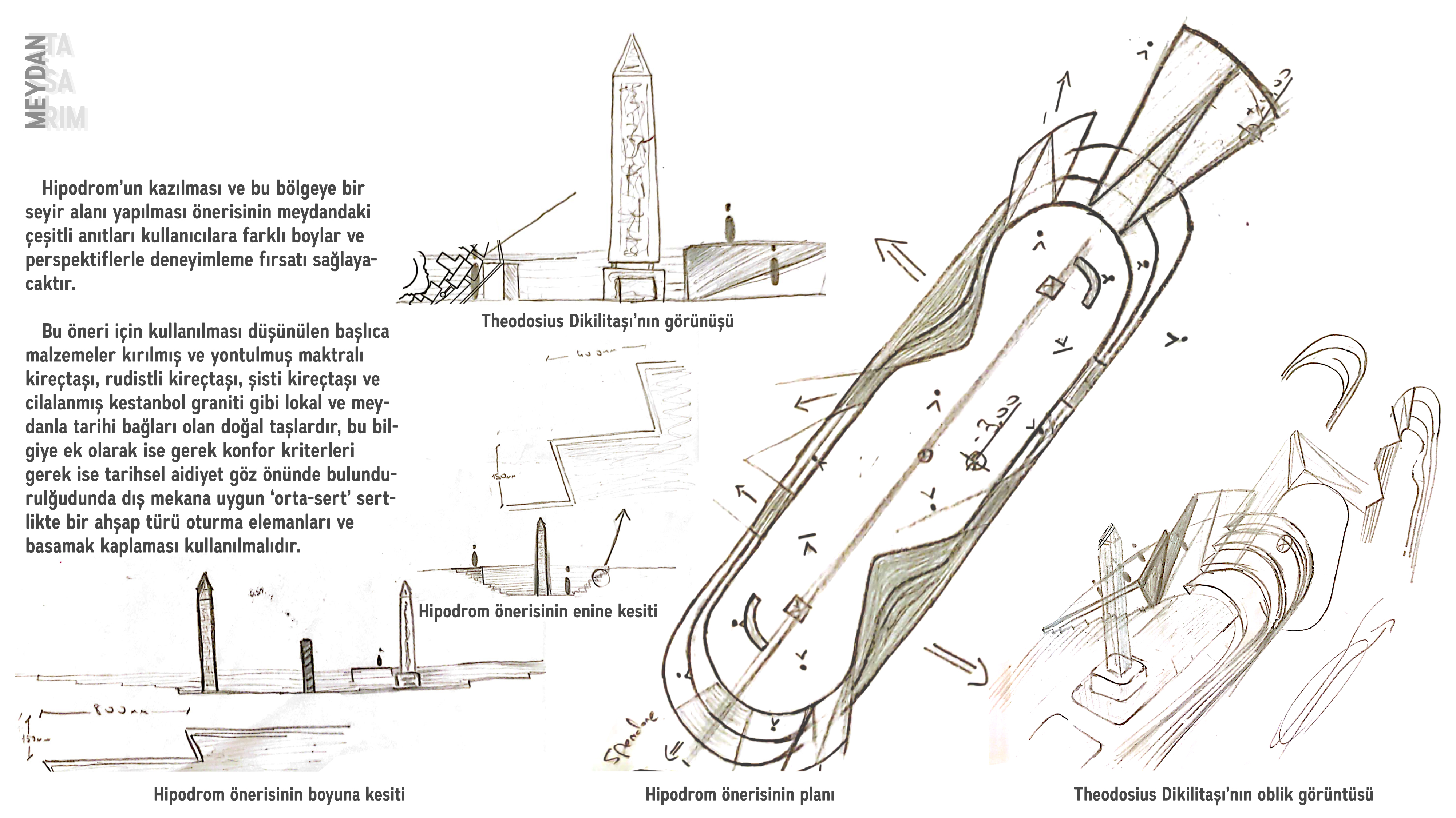 Hipodrom. Belki de İstanbul’un en ikonik kent ögelerinden birisi. Bu araştırma süresince kentin hem tarihsel hem de kültürel önem taşıyan akslarından birinin kentin çok değerli alanlarından biriyle kurduğu ilişki göz önünde bulundurulmuş ve kendine yakışır bir şekilde bir bitiş veya başlangıç noktası oluşturmaya çalışılmıştır.