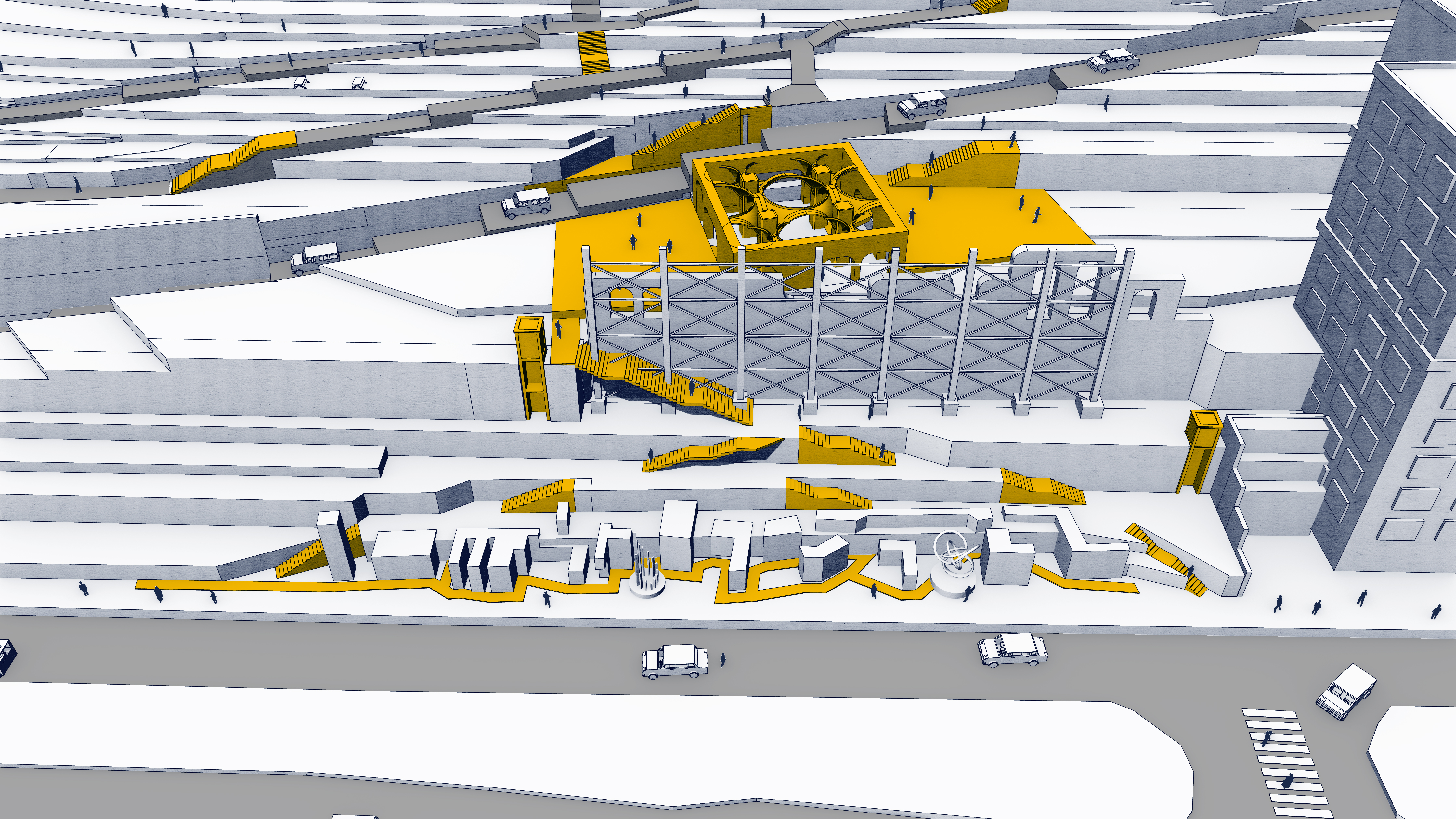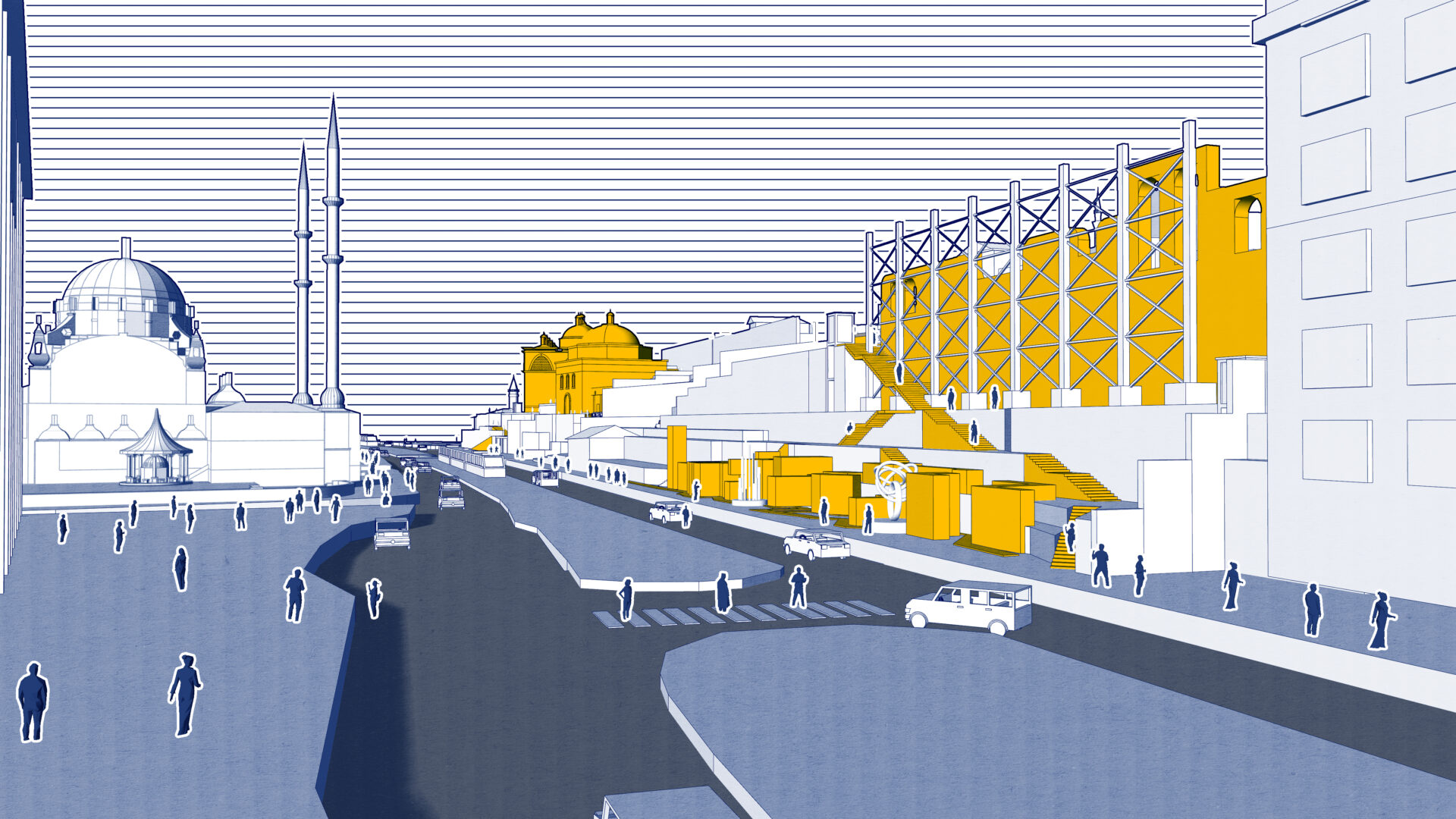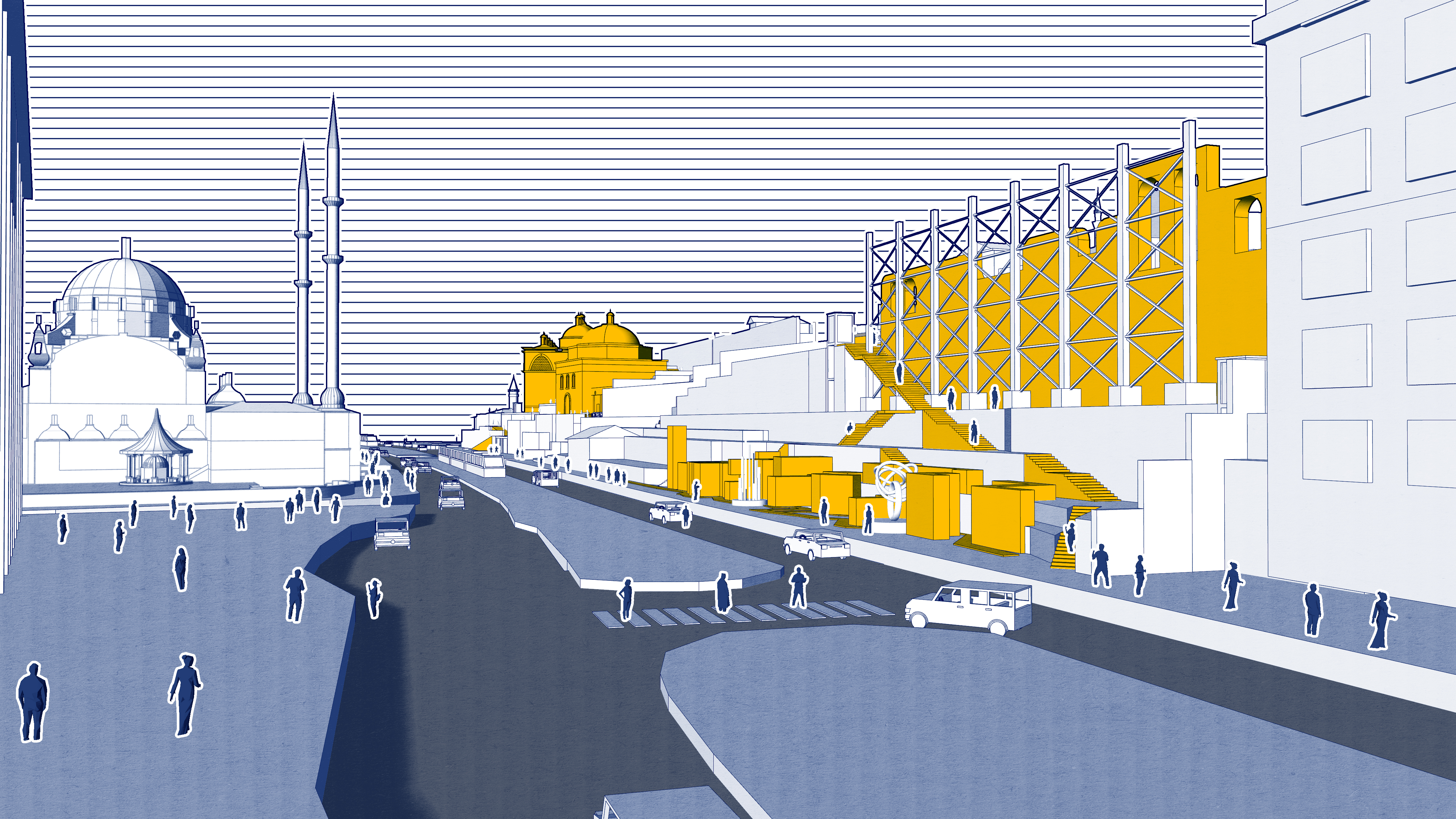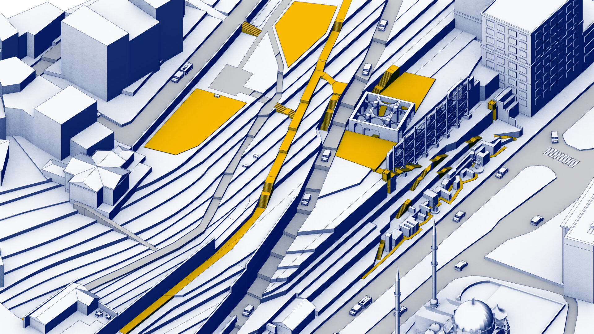 Proje bunu gerçekleştirmek için Tophane’yi konu alır. Galataport ardından Tophane’de artık açık mekanlar dahi “ihtiyaçsız” değil, çünkü Galataport bölgeye gelen her bireyi müşteri olarak değerlendirip tüketim odaklı kurgulanmış bir yapıda. Ancak sahada bulunan Tophane-i Amire, Sanatkarlar Parkı, parkın yanındaki Hamam ve Sur Kalıntıları henüz bölgedeki tüketim döngüsüne kurban olmamış açık alanlar. Bu anıtsal alanların kendi içinde dolaşım problemleri olsa dahi semte kazandırabilecekleri büyük bir kamusal alan potansiyelleri var. Proje bu üç alanda tasarım önerileri geliştiriyor, bu bölgelerin birlikte çalışmasıyla anıtsal mekanlar içinde dolaşım rotaları ve “praksis” mekanları sunmayı amaçlıyor.