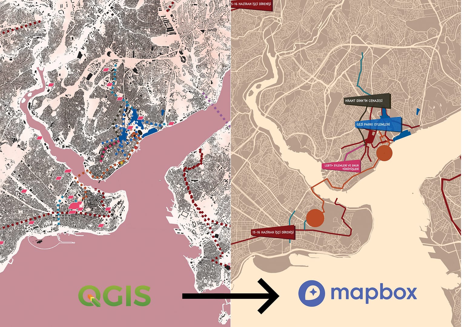 Bu çalışmada, toplumsal hareketlerin mekânla ilişkisi üzerine yapılan bir arşiv araştırmasıyla, İstanbul’daki 10 önemli eylem belirlenmiş ve bu eylemlerin mekânsal pratikleri haritalanmıştır. QGIS ve Mapbox gibi dijital araçlar kullanılarak, eylemlerin fiziksel mekânları, rotaları ve anma noktaları haritalanmış; her bir eyleme dair kartlar tasarlanarak, toplumsal hafıza ve mekânın dönüştürülmesi arasındaki ilişki görselleştirilmiştir.