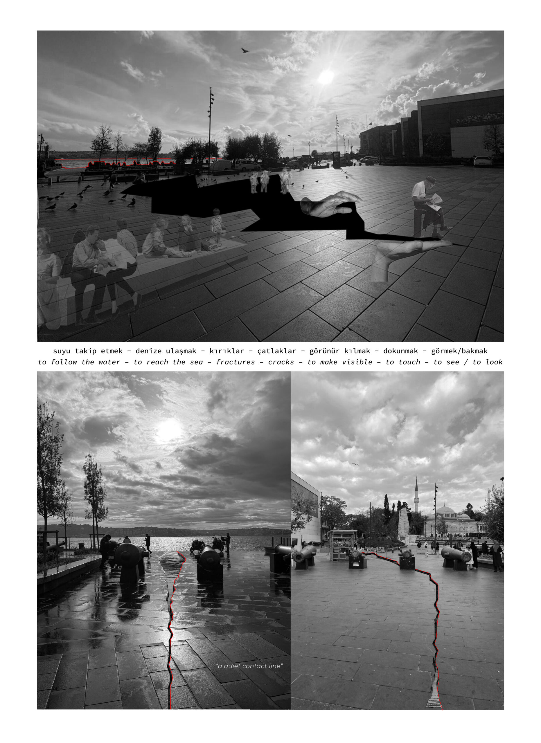 Suyun İzi, Beşiktaş sahilinde denizle kent arasındaki eşiği görünür kılan küçük ölçekli bir müdahaledir. Zeminde açılan ince yarık, suyun hareketinden türeyen bir iz gibi sahilden meydana doğru uzanır. Bu iz, yönlendirmekten çok hatırlatır; kentin gündelik akışı içinde denizi yeniden fark etmeye çağırır.