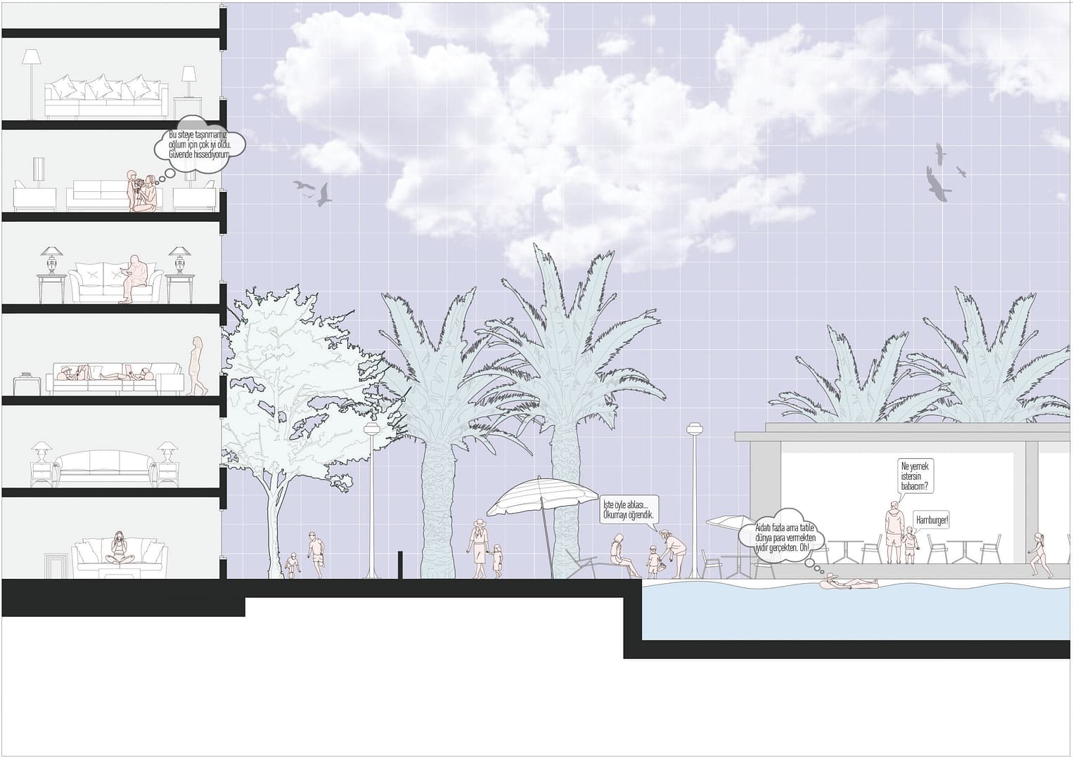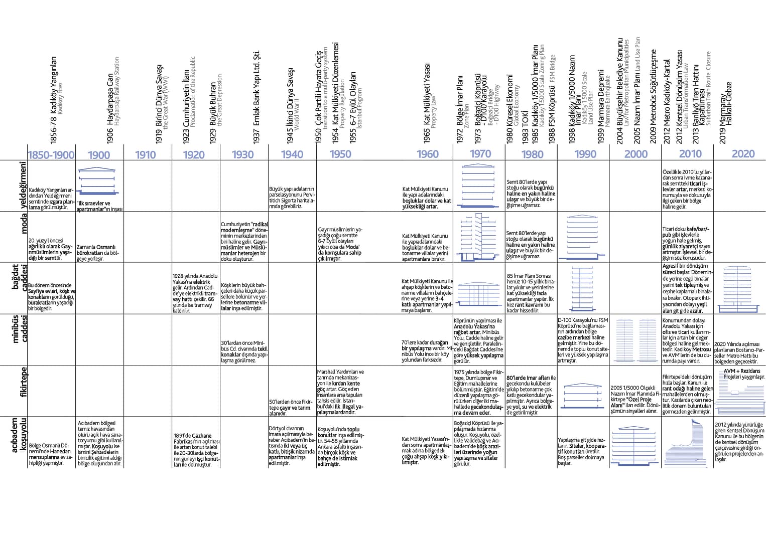 Anahtar Kelimeler: apartmanlaşma, kesit, mevzuat/mekan ilişkisi, yaşam, hiyerarşi, yıkım, jenerikleşme, aidiyet