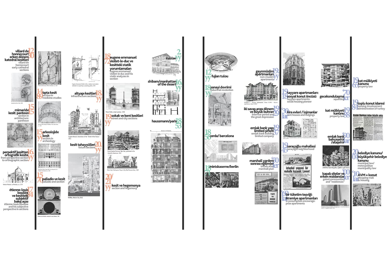 Araştırma tarihsel bir okuma ile başlamıştır. Üç temel ortografik çizim yönteminden biri olan kesitin neden projede temsil yöntemi olarak seçildiğinin anlaşılması için kesitin tarihsel süreç boyunca ne zaman kullanıldığı, nasıl anlamlar taşıdığı gibi noktalara değinilmiştir. Kesit, görülenin ardında görülmeyeni de ifade etmek ve anlamak üzerine kullanılır. Metropol yaşamını anlamak için hem fiziksel hem de kavramsal olarak görülmeyen etkileri de görünür kılmamız gerektiği için kesit temsil yöntemi olarak tercih edilmiştir.