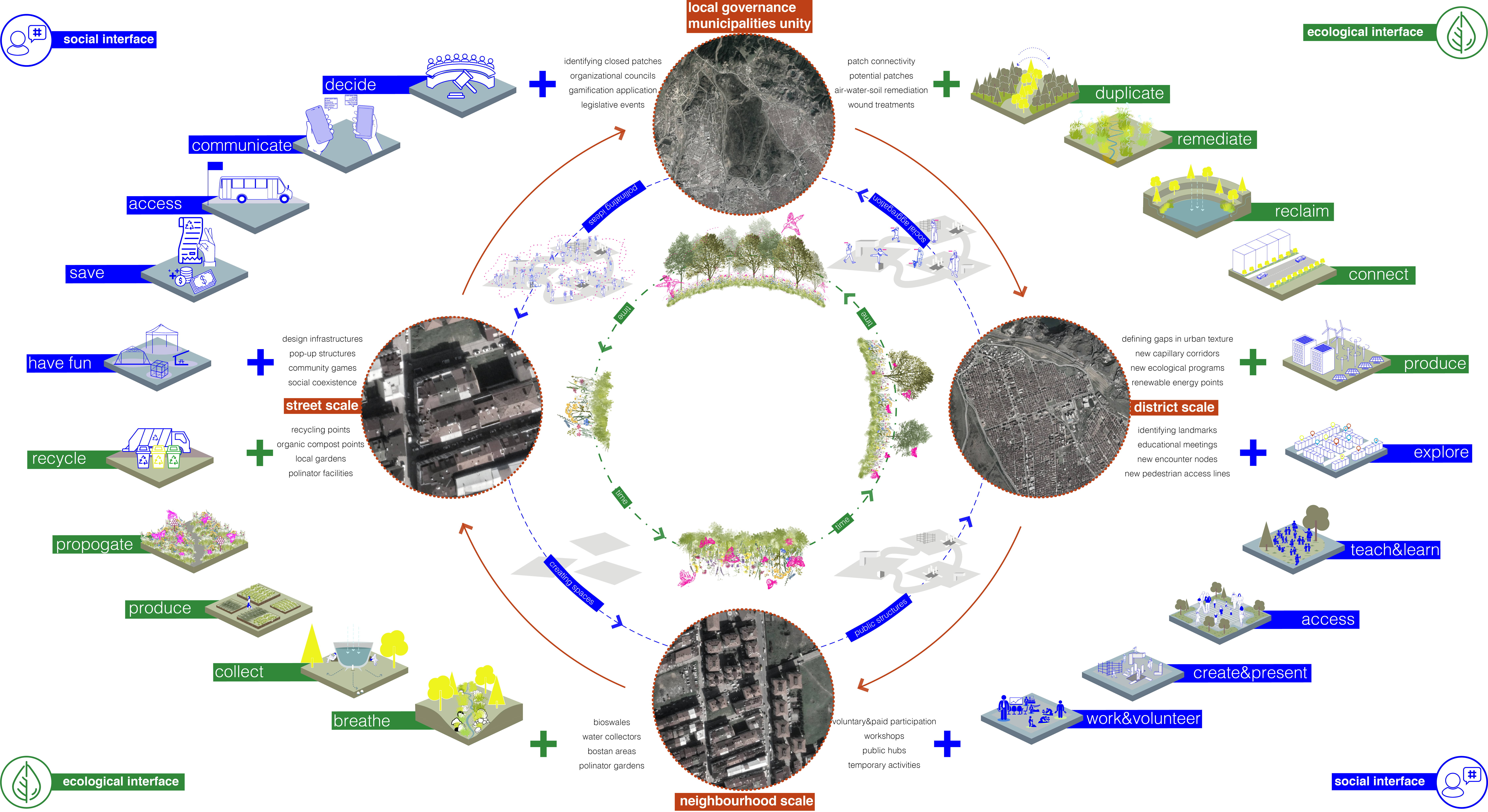 Geçmişten günümüze insan-doğa ilişkisi, değişen zaman ve yaşanan gelişmeler ile bir işbirliği halinden tüm koşullara ve değişime kapalı, insanın üstünlük kurduğu bir sistem halini almıştır. Bu projede, bu iki sistemin birbirine karıştığı kentlerde mevcut durumu okumak, insan-doğa olarak ayrışmış bu düzenin aslında aynı ekosistemin parçaları olarak işbirliği içinde yaşama olanaklarını araştırmak amaçlanmıştır. Bu işbirliği önerisine kentte hem ekolojik hem de sosyal tozlaşma temelli süsksesyon stratejileri geliştirilmiştir. İstanbul’un kuzey ormanları ile kent dokusunun kesiştiği Başakşehir-Sultangazi bölgesinde bir pilot proje gerçekleştirilip önerilerin bir emsal oluşturması ve farklı bölgelere uyarlanabilir olması amaçlanmıştır. Projede ölçekler arası geçişlerle süreç bazlı bir strateji geliştirilmiştir. Kuzey ormanlarından gelen tohum kaynağını kentin içine sızdırmak adına orman dokusu potansiyel yeni alanlarla bağlanmış ve bunu takip eden tozlaşma rotaları oluşturulmuştur. Her ölçekte bu bağlantısallığa hizmet eden yeni ekolojik düzenlemeler kent boşluklarına entegre edilmiştir. Sosyal tozlaşma için ise ekolojik altyapı ile beraber çalışan ve bir mobil uygulama ile desteklenmiş yeni karar alma biçimleri, yeni bir araya gelişler ve yeni ekopolitikalar içeren bir kentsel yaşantı önerilmiştir.
