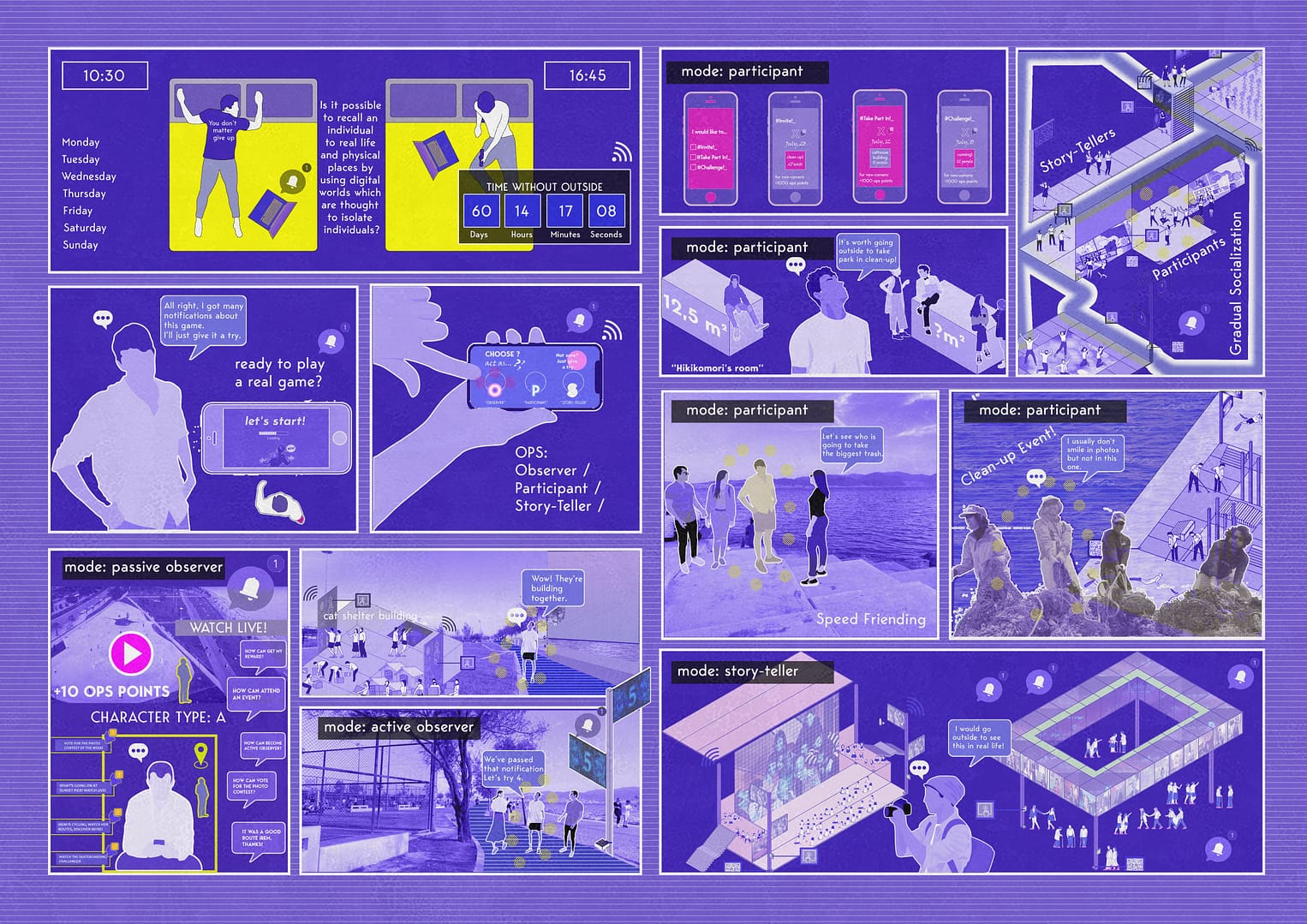 Hikikomori terimi geri hareket etmek anlamına gelen hiki ve içe dönmek anlamına gelen komoru fiillerinden oluşur. Bu bozukluk çoğunlukla hayattan kopmuş, gizlenmiş; günlerce, aylarca, hatta yıllarca odalarında yaşayan ergenlik çağındakileri ve genç yetişkinleri etkilemektedir. Hikikomori sebep olduğu yalnızlık ve izole olmak durumları doğrultusunda günümüz bireylerinde de farklı formlardaki tanımlarla kendini göstermektedir. Bireyleri izole ettiği düşünülen dijital dünyaları kullanarak bireyi gerçek hayata ve fiziksel mekanlara geri çağırmak mümkün müdür? sorusuna yanıt arayarak başlayan araştırma geleceğin hikikomorileri olarak tanımlanan bireylerin, alışık oldukları bir mecra aracılığıyla aşamalı şekilde topluma geri dönüşüne yönelik bir denemeyi konu alır. Araştırma boyunca yalnızlık ve süreç kavramlarının ilişkisi üzerinde durulmuştur. Bu çalışmanın amacı: Uyarlanabilir olma kavramı üzerinden dijital ara yüz ile mekânsal araç kombinasyonundan oluşan bir alternatif öneri geliştirerek; fiziksel mekân, sanal dünya ve oyun kavramının iç içe geçmesi ve sosyal etkileşimin arttırılmasına yönelik bir kamusal açık alan olan Bostanlı Sahili üzerinde pilot çalışmalar yapmaktır.