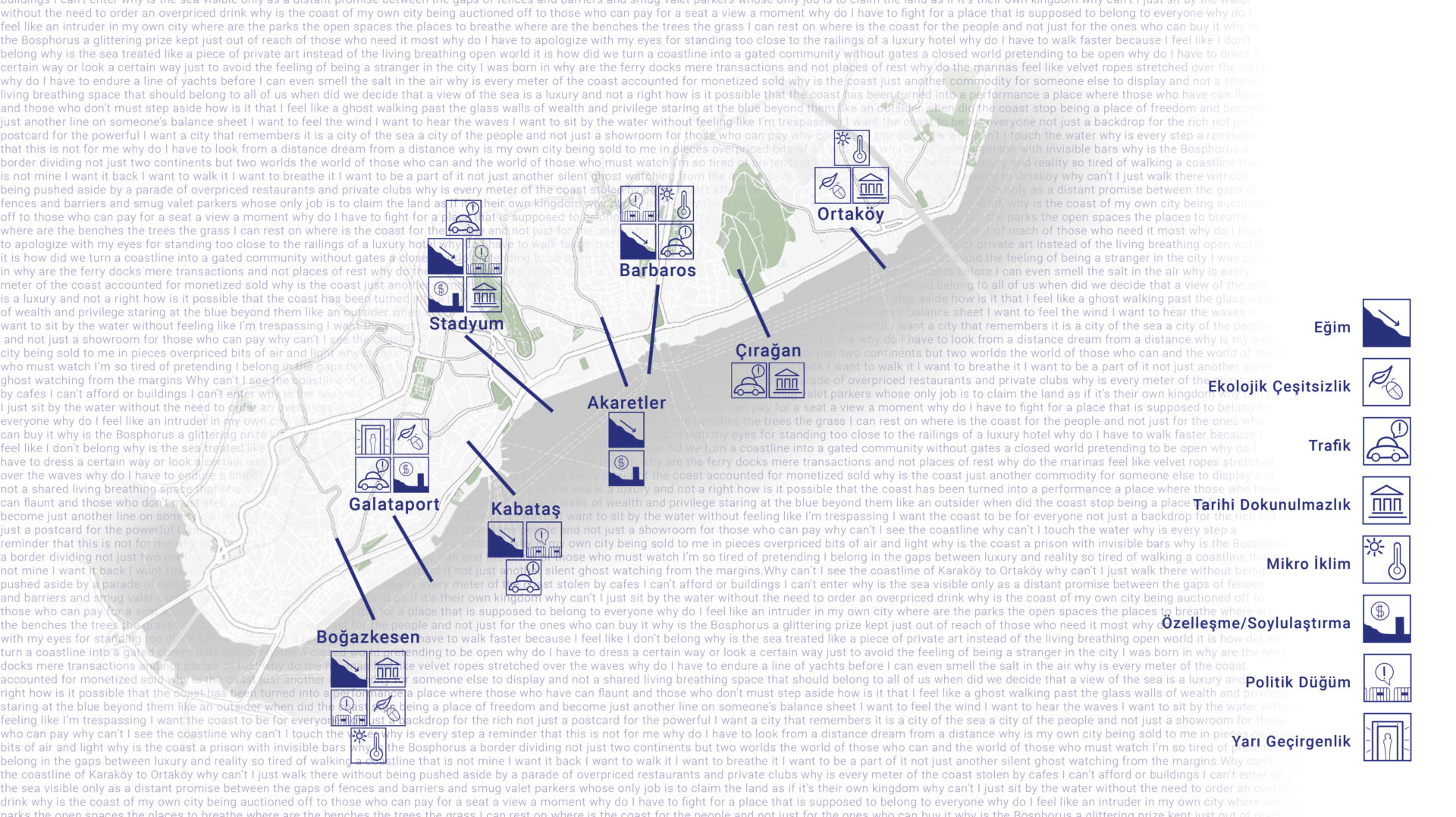 İstanbul’da, Karaköy’den Ortaköy’e kadar olarak adlandırabileceğimiz kıyı aksında çeşitli mimarlık ve şehircilik problemleri mevcut. Bu problemlerin tespiti için elde edilen bilgilerin birlikte depolanabildikleri bir veri tabanı eksikliği ve kullanıcı deneyimlerine dair bir kütüphane oluşturulması için toplu bir kaynağın ulaşılabilir olmaması gibi problemler bu sorunların çözüm aşamasına gelemeden dikkatten kaçmasına veya ahenksiz ve kentsel ölçekte problemler yaratacak şekilde çözümlenmesine neden oluyor. Kıyı aksında alınan mimari kararların bütüncül olarak ele alınması amaç olduğunda orta bir perspektiften -veya ölçekten- bu sorunların incelenmesi zorlaşmıştır. Kıyı aksındaki problemlerin çözümlenmesinde farklı kullanıcı profilleriyle, sorun tespiti ve çözümcülerini bir araya getirecek interaktif ve görsel duyuları tırmalayacak bir obje oluşturmak ilk etapta problemlerin belirlenmesi, sonraki etapta da farklı çözüm önerilerini bir araya getirerek “Derdin Objesi” ‘ni oluşturacaktır.