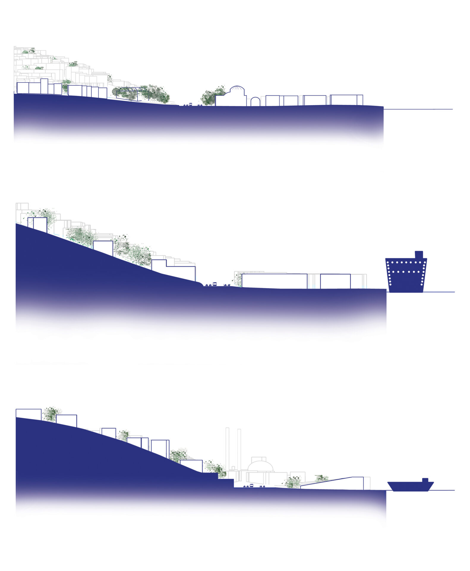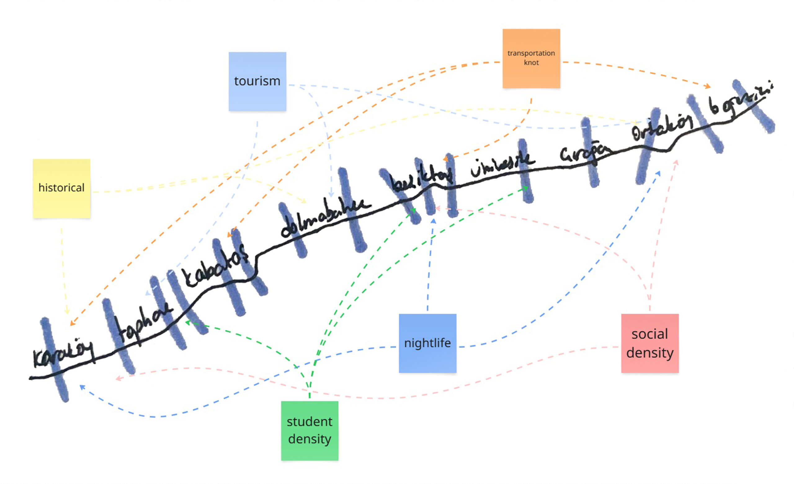 Bu proje, bahsi geçen aksta kıyının mimari ve kentsel karmaşıklıklarını araştırmaktadır. Alan, “dilimler” olarak adlandırılan farklı bölümlere ayrılarak, kıyı boyunca yer alan mimari kararlar ile bu kararların kentsel altyapıyla etkileşimini incelemektedir. Bu araştırmanın asıl merkezi değeri heterotopya konseptidir — normların dışında var olan, aynı anda hem gerçek hem hayali olan, geleneksel mekânsal ilişkilerin bozulduğu alanların kentsel ölçekte incelenmesi. Arşiv araştırması, insan ölçeği üzerine okumalar ve mekansal analizler aracılığıyla, bu alanın farklı noktalarındaki deneyimlerin nasıl farklılaştığı, kıyı ile kesişen ya da paralel giden yolların ek katmanlar oluşturduğu keşfedilecektir. Her bir “dilim”, bu heterotopik alanların derinlemesine incelenmesi için bir odak noktası olacak ve burada ortaya çıkan özgün mimari problemleri ve toplumsal sonuçları açığa çıkaracaktır.