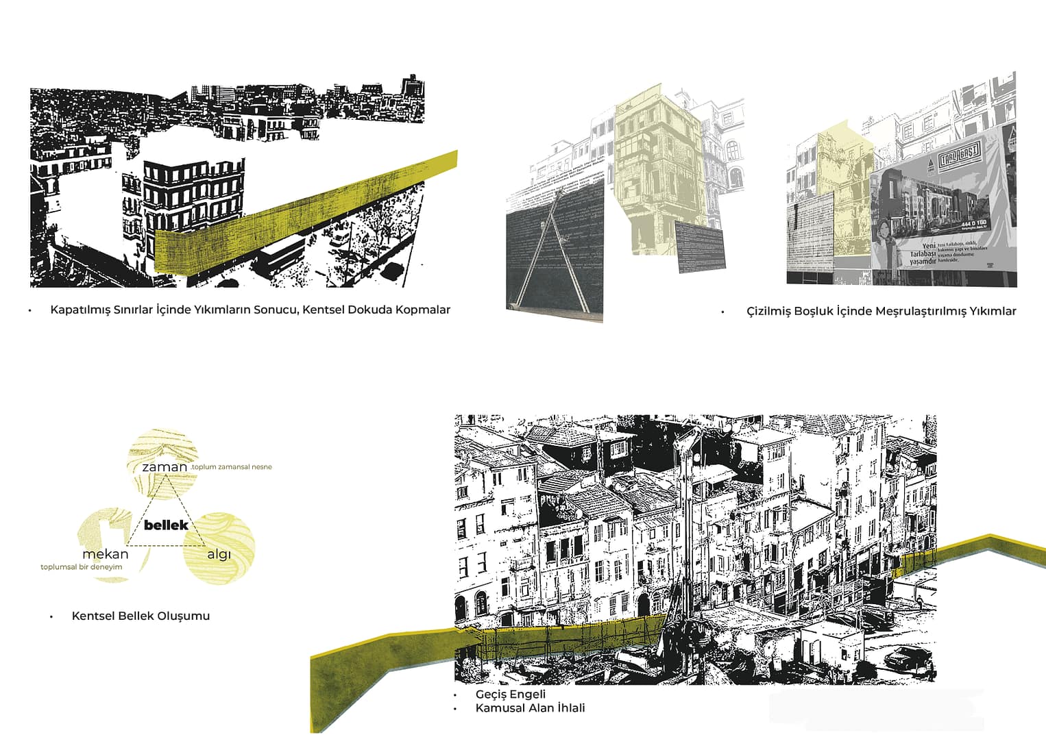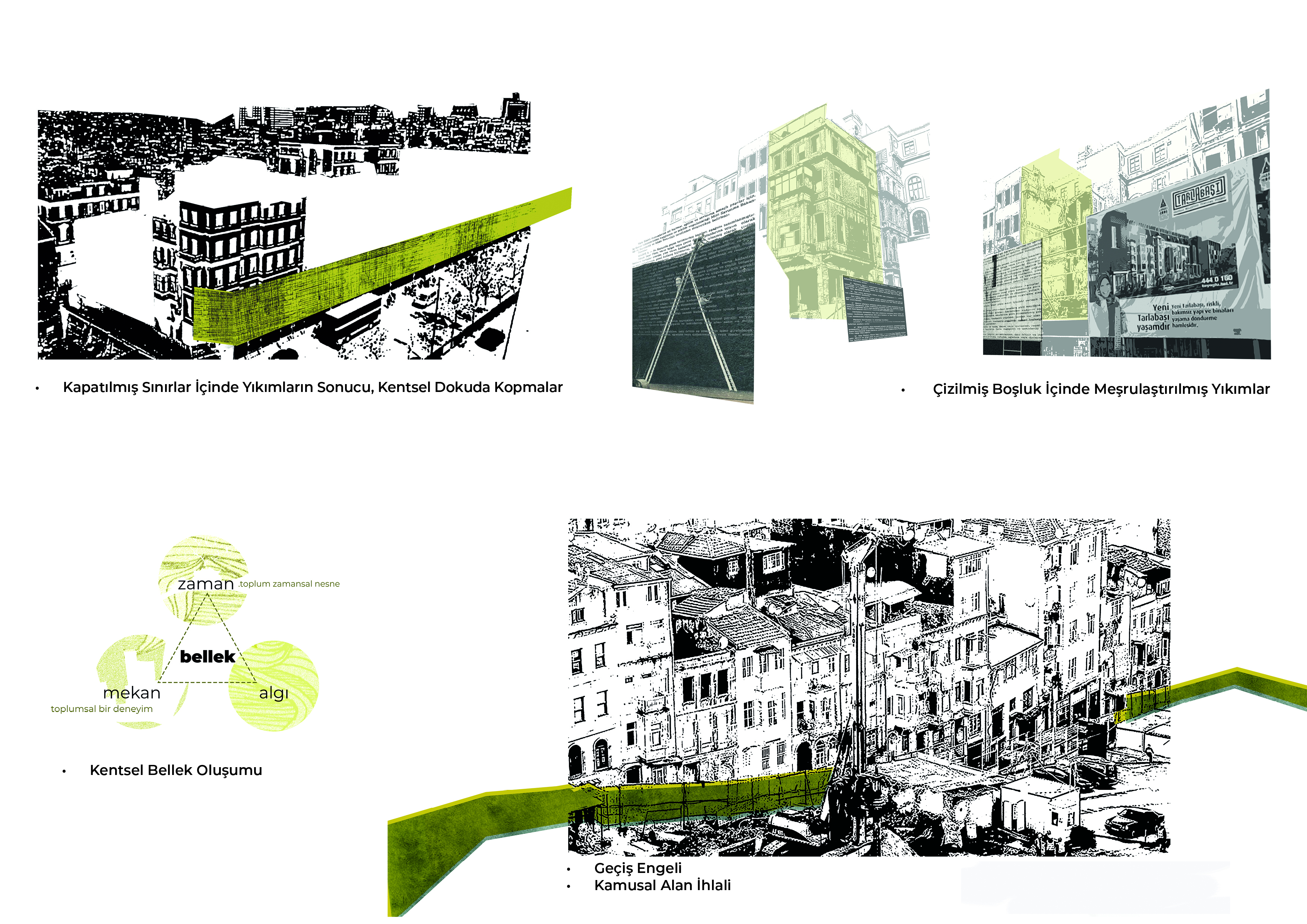 Belleğin yıkımı, zaman, mekan ve algının kolektif belleğe dönüşümü ve bu ilişkilerden herhangi biri eksildiğinde sürecin nasıl işleyeceği üzerine bir incelemedir. Tarihsel süreçte Tarlabaşı’nın kentsel bellek oluşumu ve kaybı değerlendirilmiştir.