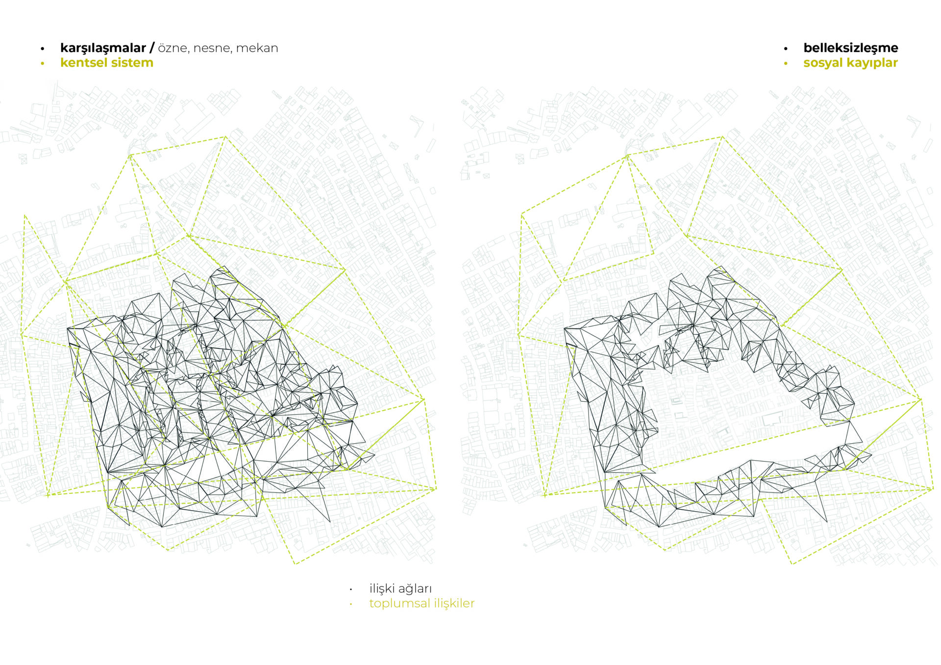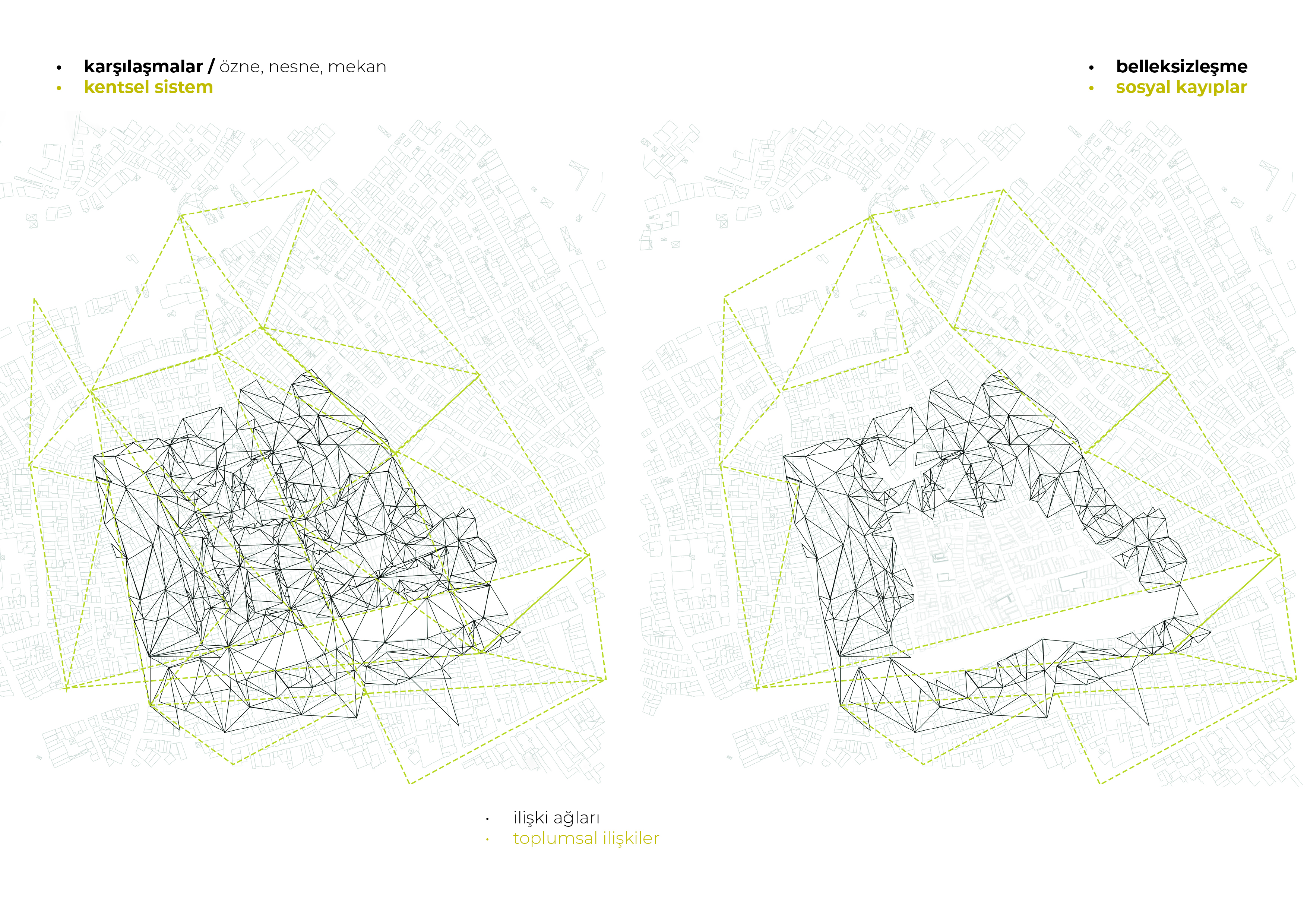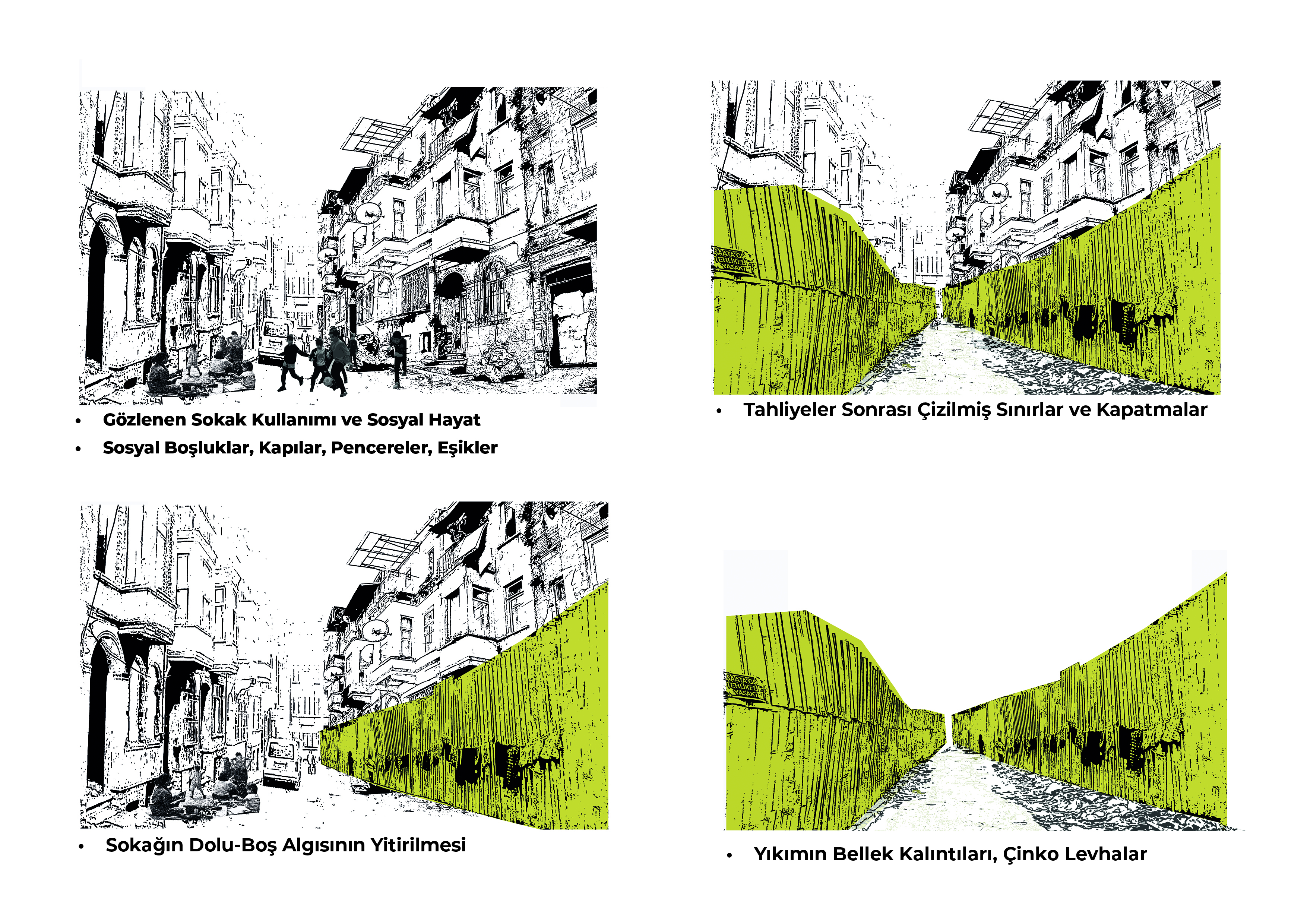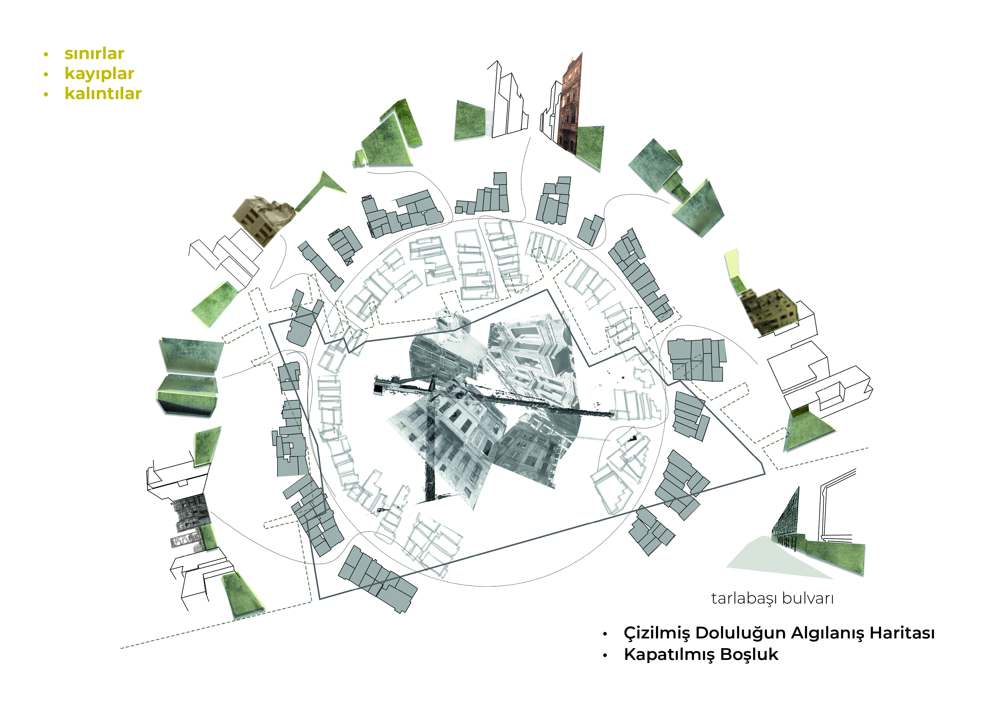 Bu araştırma projesinde, kentsel dokuda sosyal ve fiziksel olarak içi boşaltılmış, terk edilmeye zorlanmış, istimlak edilerek açılan boşlukların kentsel bellekteki süreci gözlemlenmiştir. Tarlabaşı kentsel dönüşüm süreci özelinde, ilişki ağlarının, kentsel sistemin nasıl etkilendiği, kamusal boşlukların ve toplumsal ilişkilerin değişimi üzerinden bir inceleme hedeflenmiştir.