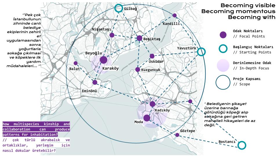 ‘İhtimam Gelecekleri’ kentteki güç sistemlerini yapısöküme uğratmayı ve bunların İstanbul’un kentsel mekanlarında nasıl araçlar, boşluklar, ritüeller ile yeniden üretildiğine ‘bakmayı’ amaçlar. Kimlerin geleceği? Kimlerin geçmişi? Kimlerin tasarımı? Kimler katılıyor ve kimlere dikkat veriliyor? Kim susturuluyor ve kim sessiz? Kim etkili ve kim etkileniyor? Tasarım süreçlerinde kim kalacak ve çıkacak? Kim ‘ihtimam’ gösteriyor? Bu sorularla beraber tasarımın etik bir sistem tarafından değerlendirilebilir olmasını sorguluyorum. Sorumluluk, kentte insan-merkezcilik ve düalizmin ötesinde bir “akrabalık” yoluyla harekete geçirilebilir mi?