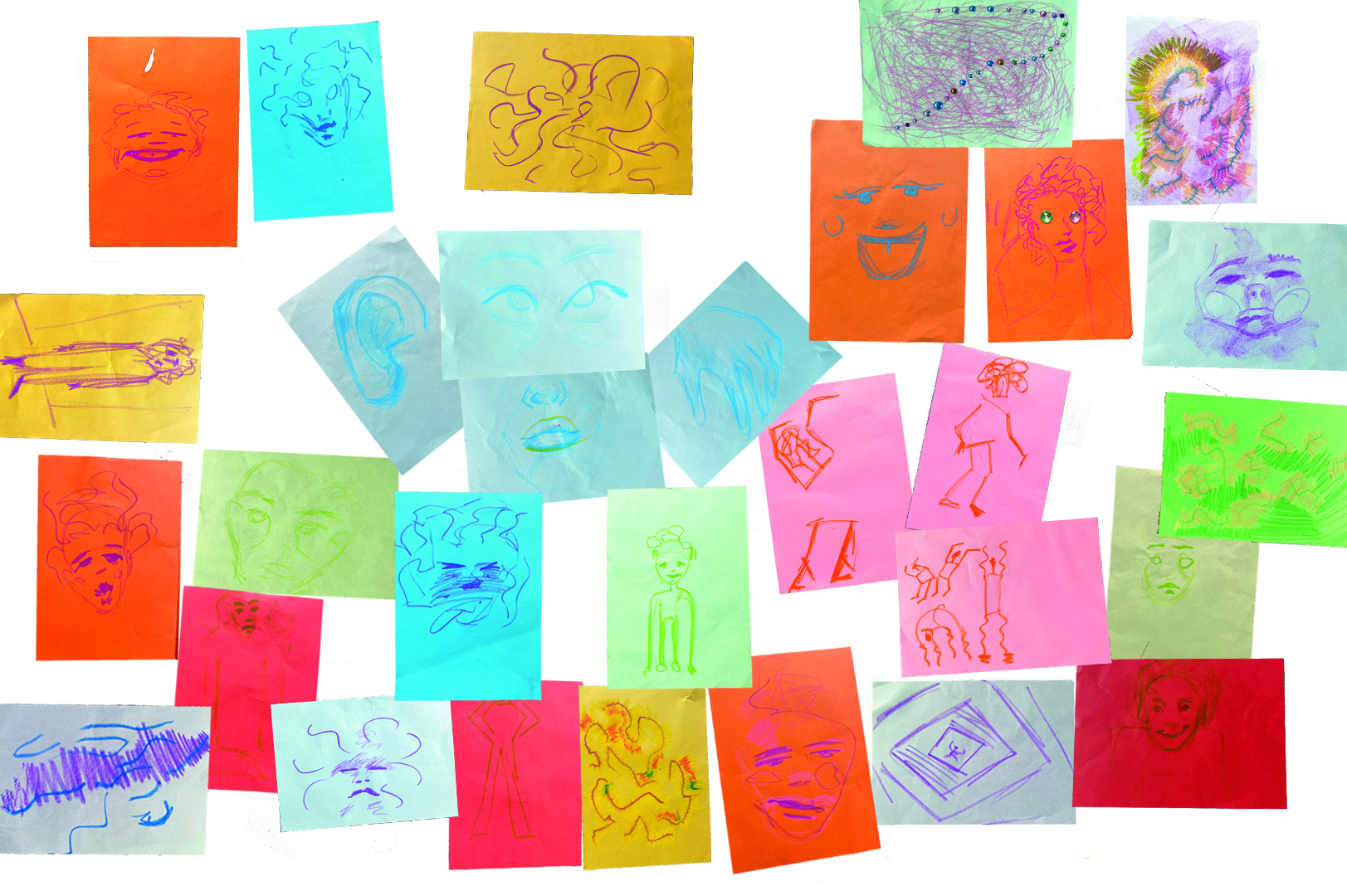 1- Ayna: Sen kimsin?” sorusuna tek bir yanıt vermek yerine, iki saatlik otomatik çizim süreciyle değişken, sabitlenemeyen bir benlik hâlini kayda aldım. Düşen ve yer değiştiren çizimler, kimliğin tekil bir cevap değil, sürekli hareket eden parçalar bütünü olduğunu görünür kılıyor.