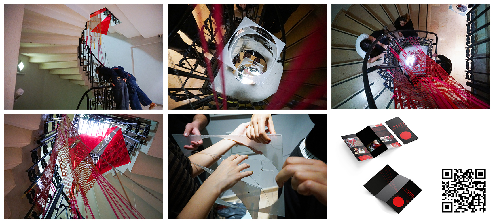 Yangın Muhbirleri için Acil Çıkış II: Sinanpaşa İş Merkezi’ndeki bu mekâna özgü yerleştirme, görünür yüzeylerle gizli altyapı arasındaki eşiği, merdiven boşluğunda kurulan yarı saydam bir portal üzerinden açığa çıkarır. Işık, yansıma ve geçici bağlantılarla mekân algısını çoğaltan iş, yalnızca o yerde ve sürede var olan bir geçiş hâli önerir.