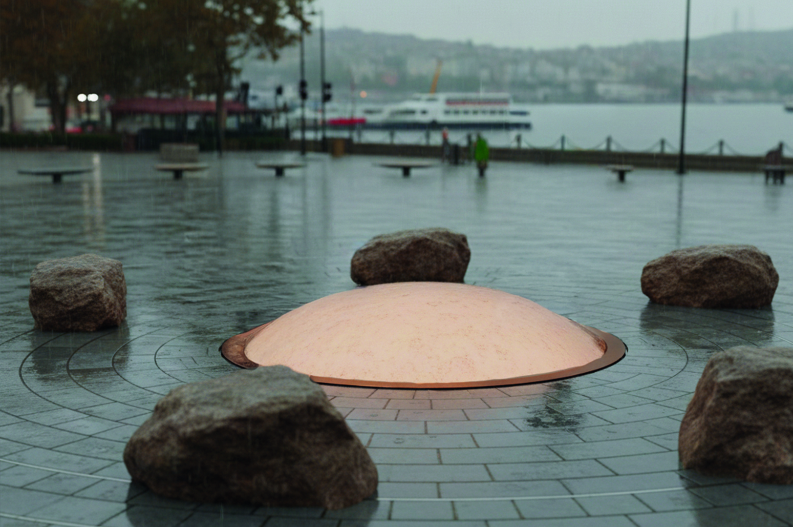 5- Yağmurun Şarkısı: Bu kamusal ses yerleştirmesi, yağmuru bir müzisyene dönüştürerek tükenen su kaynaklarına dikkat çeker ve yağmurun kutsallığını kutlar. Zemine gömülü bakır kubbe, rezonans boşluğu ve farklı kalınlıklardaki yüzeyiyle yağmur damlalarını melodilere çevirerek şehir içinde meditatif bir dinleme alanı yaratır.