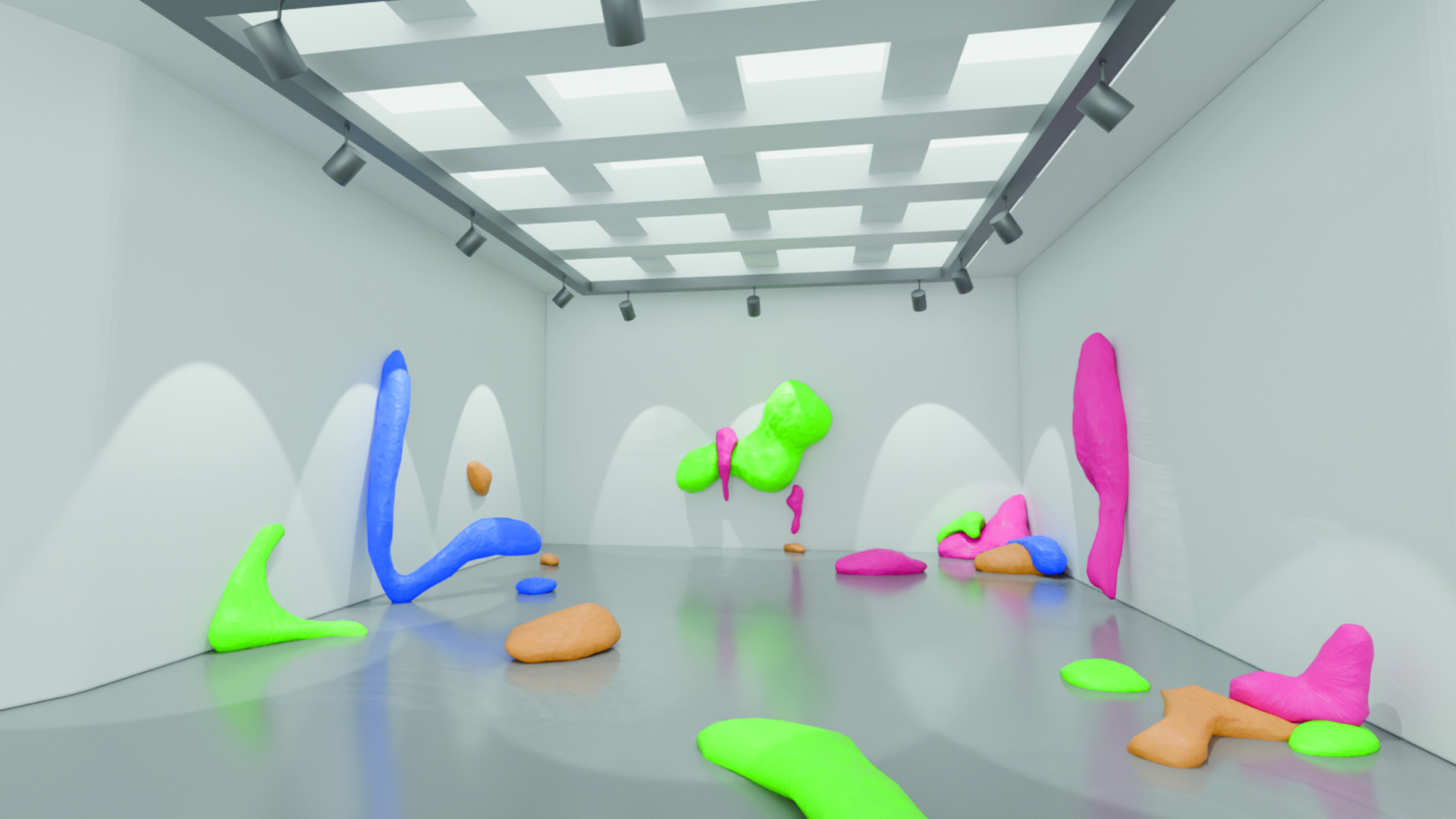 7-Clayground: Clayground, çocukluktan bugüne uzanan oyun hamurunu güvenli bir üretim alanı olarak ele alır. Dijitalde kurgulanan ve fiziksel maketle karşılık bulan bu yerleştirme, galeri mekânını oyun, temas ve dağılmış formlar aracılığıyla kişisel bir güvenli alana dönüştürür.