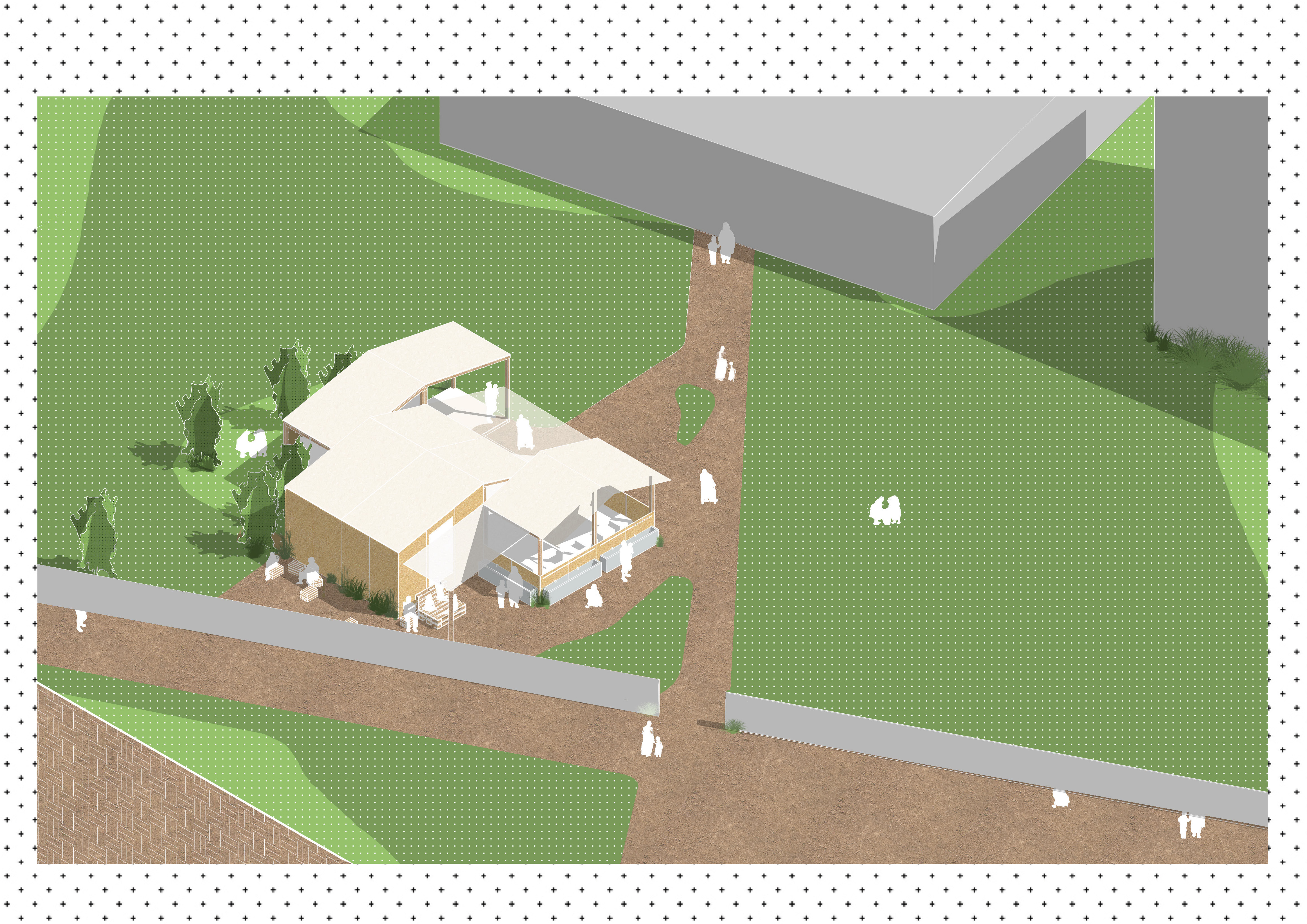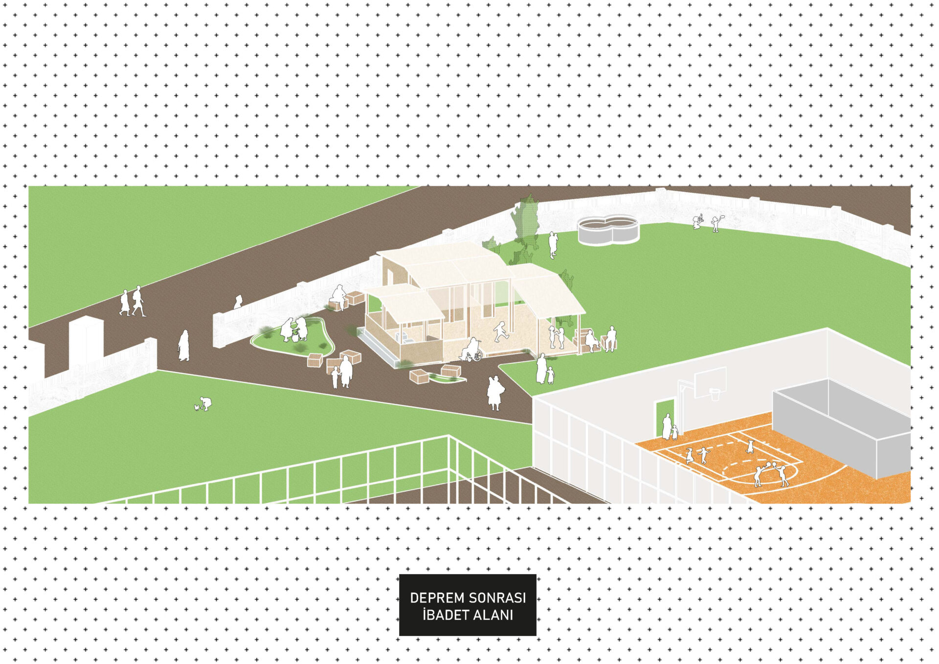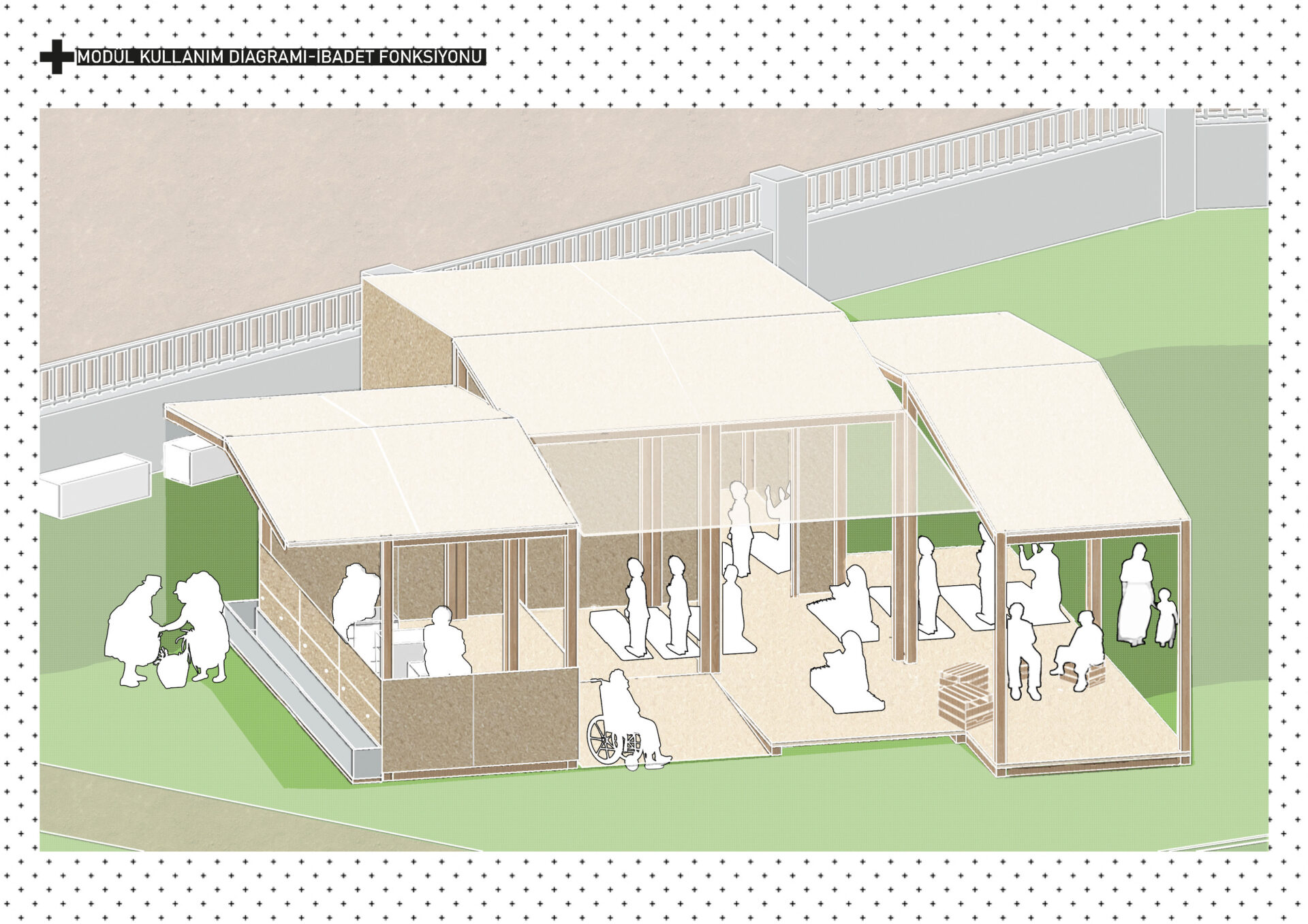 Sümer Ortaokulu’nun çevresinde Kaf Kolektif’in katkılarıyla oluşmuş komünitede, yapılan görüşmeler sonucu ihtiyaç duyulan sosyal alan ve ibadet mekanı tasarımı için çalışıldı. Tasarıma başlarken belirlenen prensipler doğrultusunda oluşturulan bir yol haritası ile çalışıldı. Bu prensipler; taşınabilirlik, çoğalabilirlik, kolay kurulum ve esnek tanımlı mekanlar oluşturmaktır. Belirlenen programların hepsine cevap verebilecek bir birim tasarlandıktan sonra birim dönüştürerek kullanılmasına olanak sağlayan bir kompozisyon oluşturuldu.
