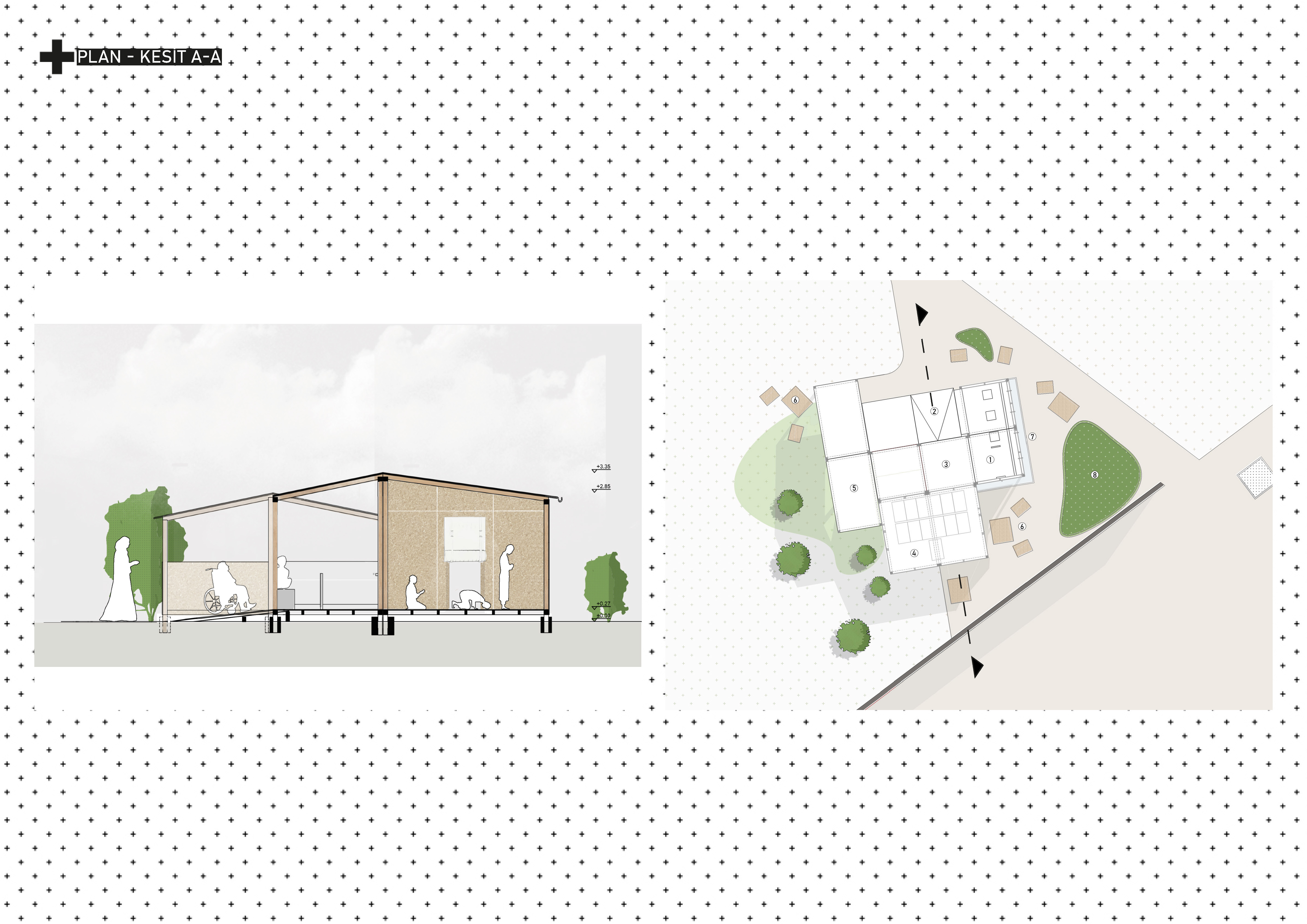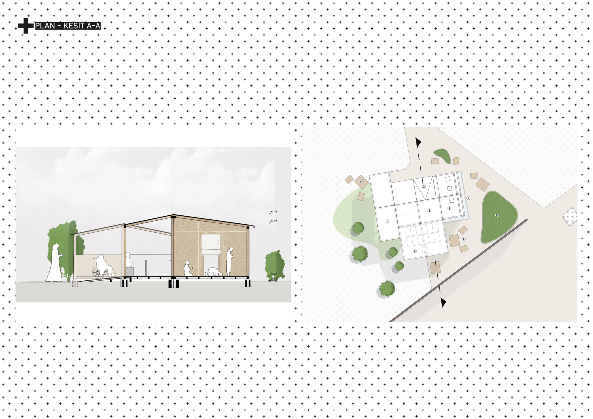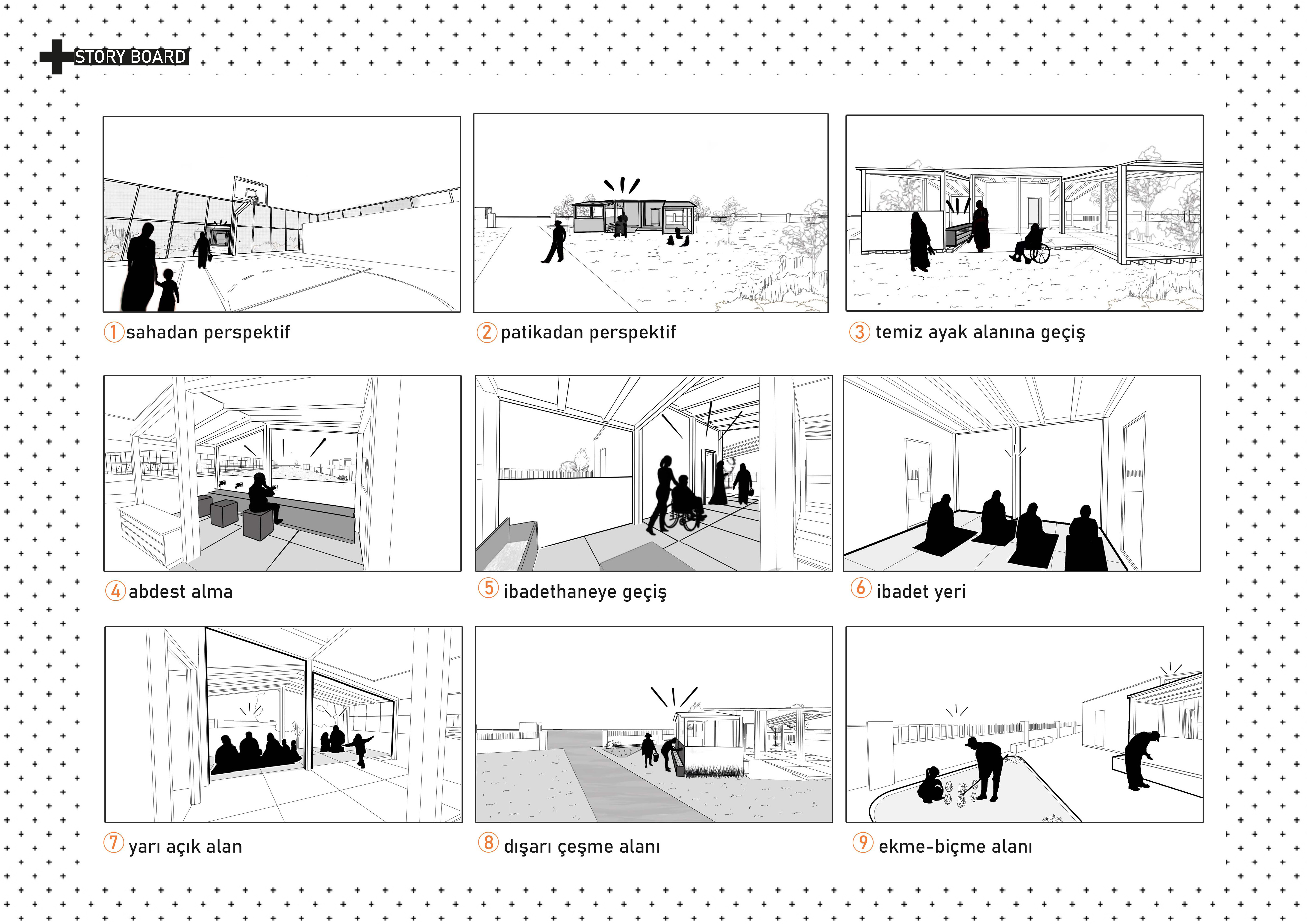 on iki kişilik ibadet mekanı, yarı açık sosyal alan ve tüm bu birimlerin birbirine bağlayan yükseltilmiş bir zemin olan platform. Kompleksin erişilebilir ve engelsiz olması için platforma çıkış rampa ile sağlanmıştır.