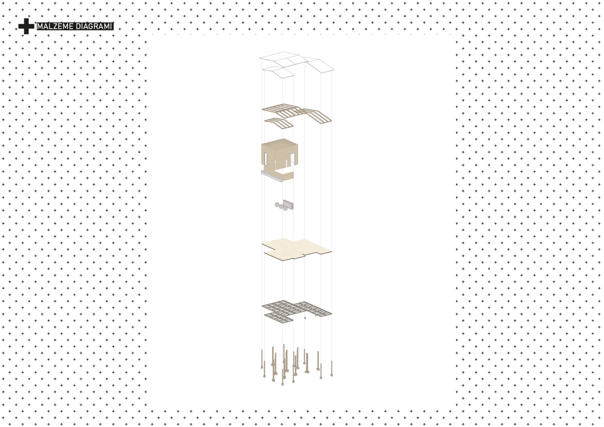 Tasarımda kullanılan malzemelerin kolay ulaşılabilir ve uygun maliyetli olması önemsendi. Bu nedenle çevre illerden temin edilebilecek; OSB, ahşap kereste, membran ve ahşap kasalar tercih edildi. Modüller için oluşturulan kurulum şeması sayesinde mekan, herkes tarafından inşa edilebilecek ve eklemlenebilecek biçimde kurgulandı.