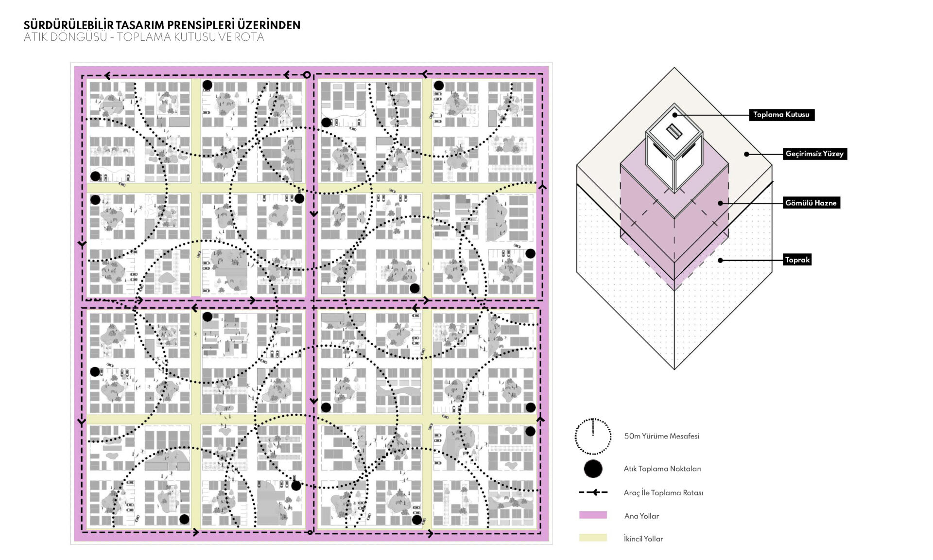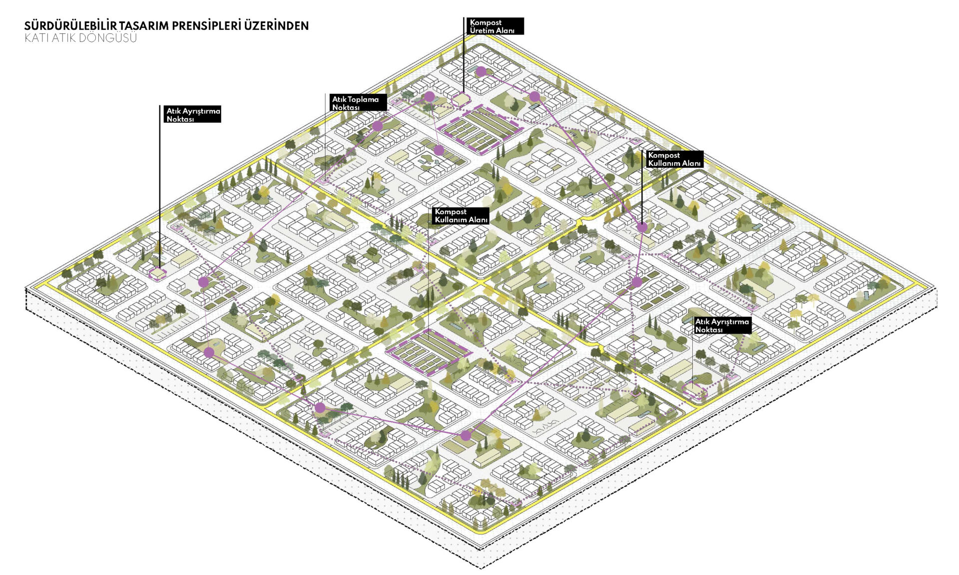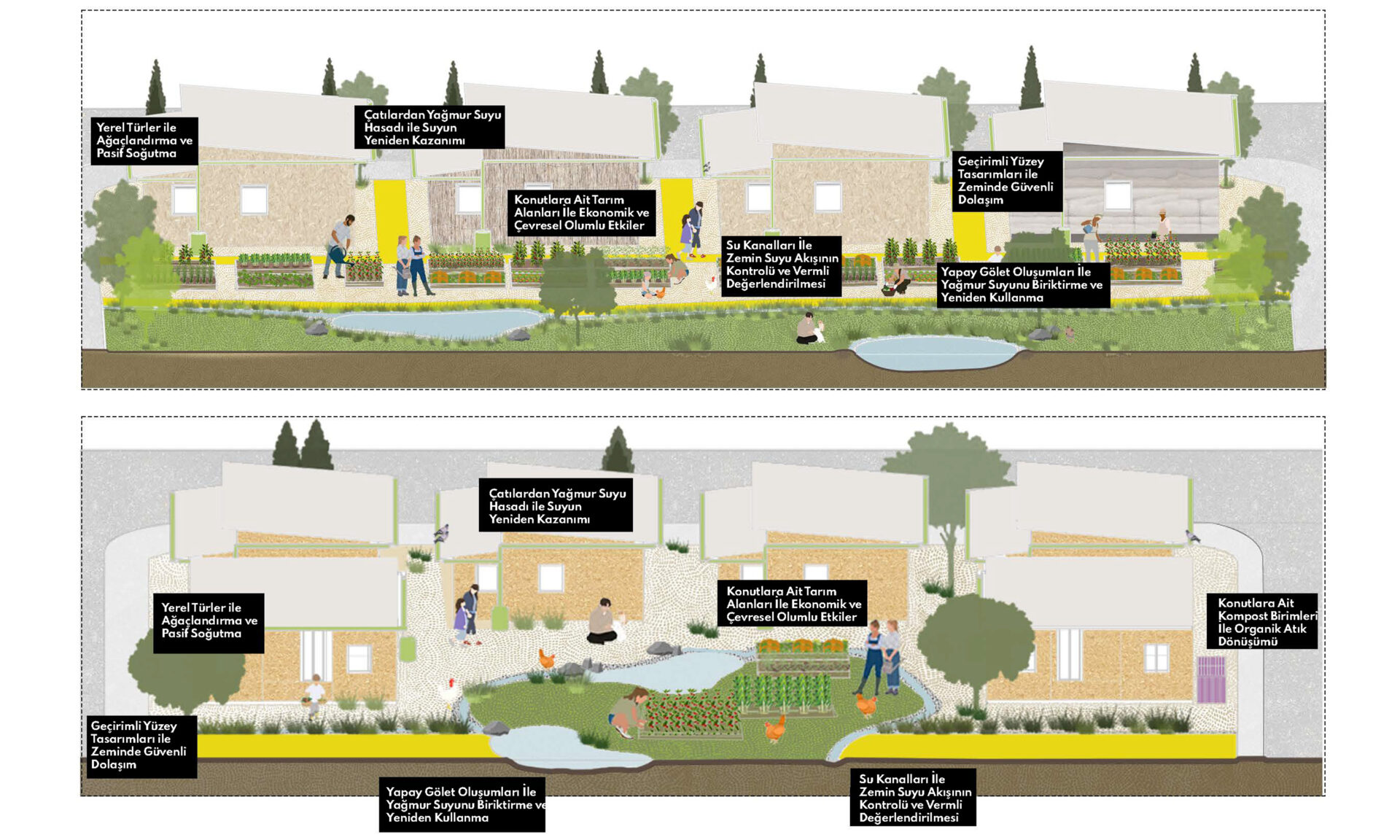 Kent, yerleşke, birim (konut), malzeme gibi farklı ölçeklerde ve farklı programlar için gereken tasarım koşulları ile bir dağarcık oluşturduktan sonra bu dağarcık içinde Kahramanmaraş için acil ve kısa sürede gerekli olan konuların üzerine yoğunlaştık. Bu konular içerisinde kısa vadede ve acil çözüm bulunması gereken konular; temiz suya erişim, termal konfor, güvenli tasarım ve kentsel hijyen. Sorunlara çözüm olarak önerdiğimiz tasarım prensipleri ise; yağmur suyu hasadı, su döngüsü, pasif iklimlendirme stratejileri ve atık yönetimi oldu. Tüm bu çözümlerin enerji verimliliği açısından yeterli olması ve kullandığı kaynaklar, uygulanma yöntemleri açısından da çevreye yeni sorunlar teşkil etmemesine özen gösterdik. Tüm çözümlerin doğal etmenlerin organizasyonu ve minimum inşai müdahele gerektirecek şekilde kendine yetecek ve içinde döngüsünü kuracak bir sistem tasarımı üzerinden gerçekleşmesi hedeflendi.