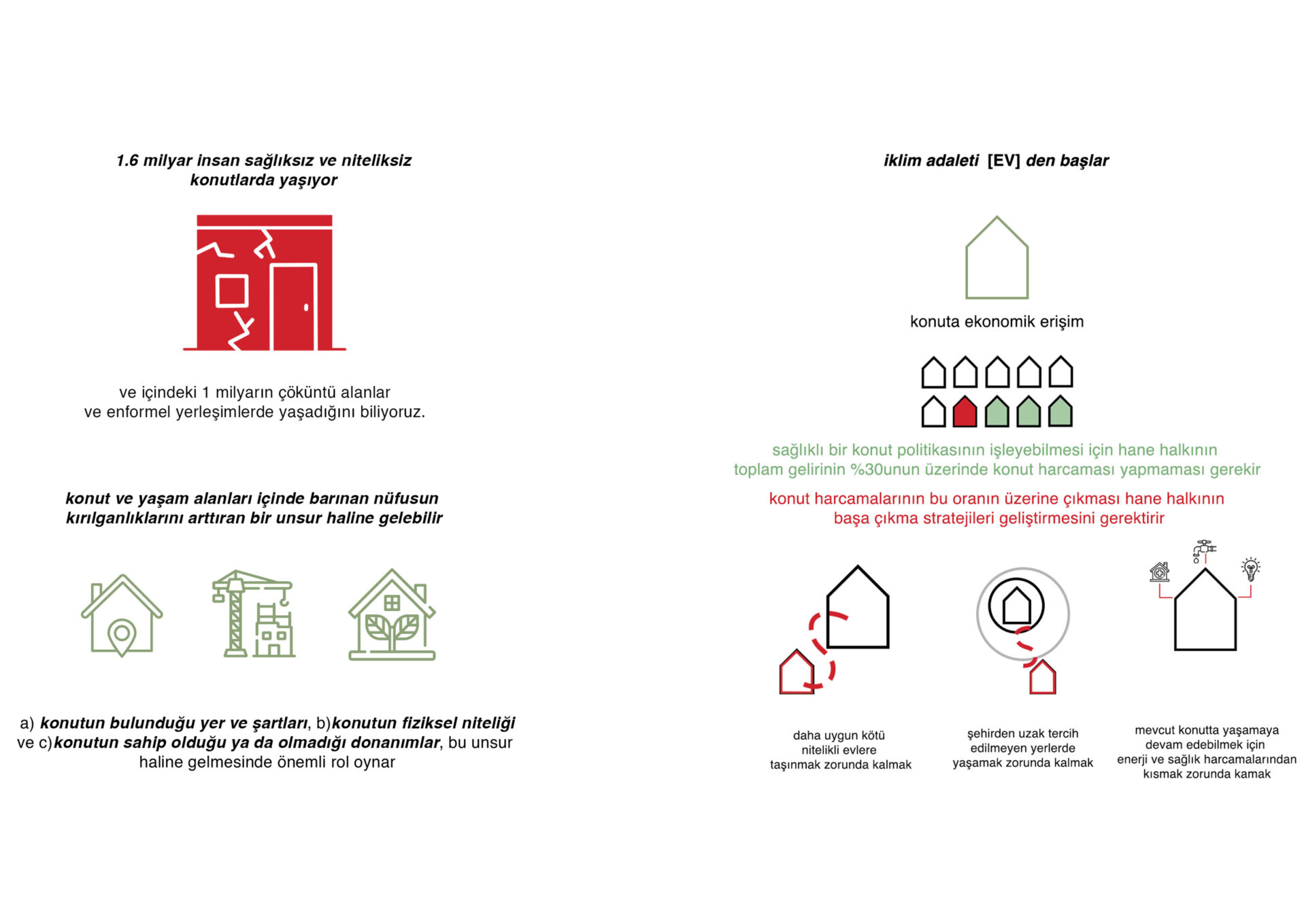 Hedeflenen etkiler; gün ışığı alımı, hava sirkülasyonu, konut içersine sızan yeşil, yapı dayanımı, minimum tesisat ayak izi, yeşil duvar, düşey tarım alanı, yağmur suyu hasadı, su döngüsü gibi ekolojik çözümlerle sağlanacak. Yapının boyutuna ve programına göre değişip evrilebilecek olan iklim adaleti çekirdekleri, daha çoğalabilecek senaryolar üzerinden üretildi. Çalışma ana hatlarıyla, minimum müdahale ile kent dokusu ve sosyal konut üretimini belirli bir kalıp içerisinde tanımlamadan, ona esneklik için alan tanıyarak adil iklim koşullarının bir yapı birimi olan çekirdek üzerinden sağlanmasını araştırdı.