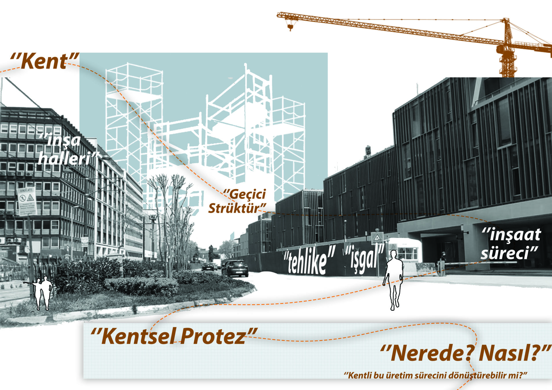 Metropollerdeki inşaat alanlarının yapım süresi boyunca zaman algısını değiştiren, geçici bir strüktür olan inşaat iskeleleri araştırma konusu olarak ele alınmıştır. Kent içerisindeki inşaat faaliyeti gösteren alanların çeperlerini kuşatan geçici strüktürlerin inşaat bittikten sonra diğer inşaat sahasına taşınmasıyla ya da inşaat süresinin uzaması ile aslında hayatımızda kalıcı hale gelmektedir. Araştırmanın amacı, işgalci pozisyonda var olan bu eklentilerin tersine bir bakış açısıyla kentlinin işgalci pozisyona gelmesi durumunda iskelenin kent içerisindeki yerini ve yeni kazanabileceği potansiyelleri ortaya çıkarmaktır. Ballantyne (2012)’ın aktardığı üzere, Deleuze ve Guattari, duyu organlarımızı makineler olarak tasavvur ederler ve kullandığımız tüm araçların bu makinelerin parçaları haline geldikleri ifade edilmektedir. Sonradan takılan parçalar birer proteze dönüşür. Kent bir beden olarak okunduğunda ise o beden zamanla gelişmesiyle yeni durumlara adapte olmaya başlamaktadır. Mevcut ihtiyaçlara, şartlara göre kente eklemlenen strüktürler artık kentsel protezler olarak hayat bulmaya başlamaktadır
