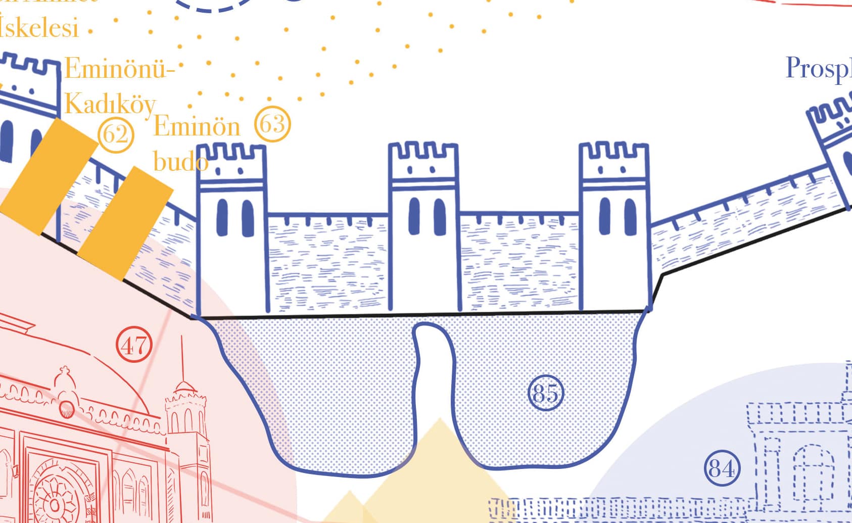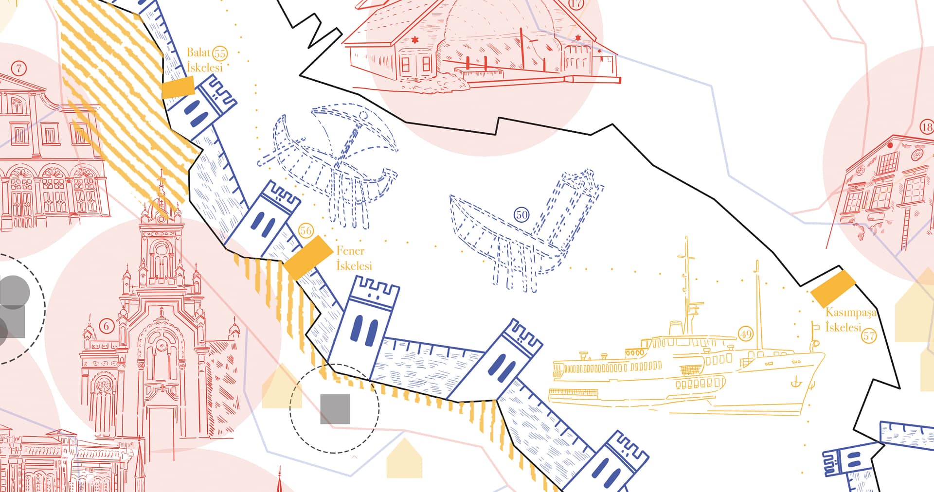 Atlas Haliç’in kıyı kimliğini oluşturan öğeleri minyatür haritalama tekniği ile görselleştirmekte ve renk kodları bu öğeleri dönemlerine ayırmaktadır.