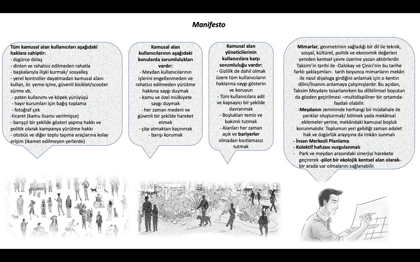 Çalışmanın odak noktasında 2020 yılında İstanbul Büyük Şehir Belediyesi tarafından düzenlenen Taksim Tasarım Yarışmasının teknik şartnamesi incelenmiş olup, şartnameyi hazırlayan önemli isimlerden mimar Haydar Karabay ile birebir görşmeler de yapılmıştır.Yürütülen çalışmalar sonucunda, Taksim Meydanı Yarışması’nda üç eşdeğer projenin olumlu ve olumsuz taraflarına eleştirel bir bakış açısıyıla yorum getirilmiştir.Bu eleştirel bakışı besleyen argümanlar ise Taksim’in yarışmalar tarihinin mihenk taşlarında olan Behruz Çinici ve Vedat Dalokay’ın projeleri hem geometrik hem de gramatik açıdan değerlendirilmiştir. Bu değerlendiremeler sonucunda Taksim Meydanı tasarımına bir gelecek önerisi olarak yarışma manifesitosu geliştirilmiştir.