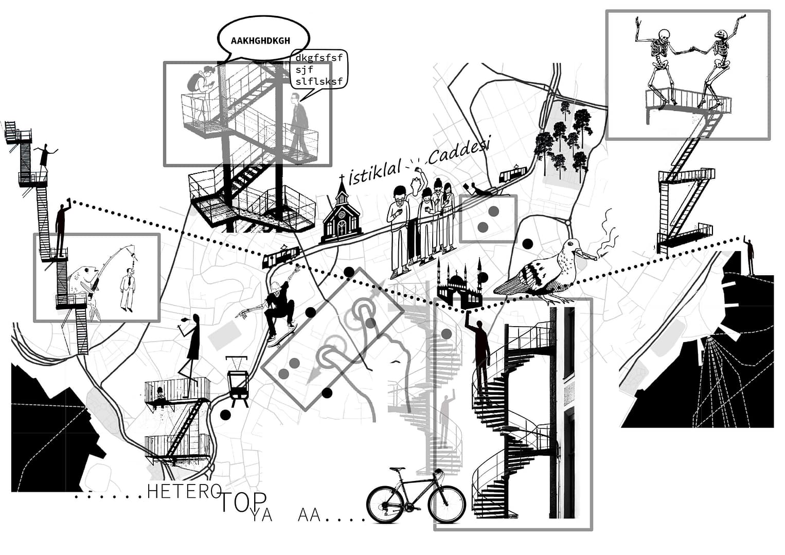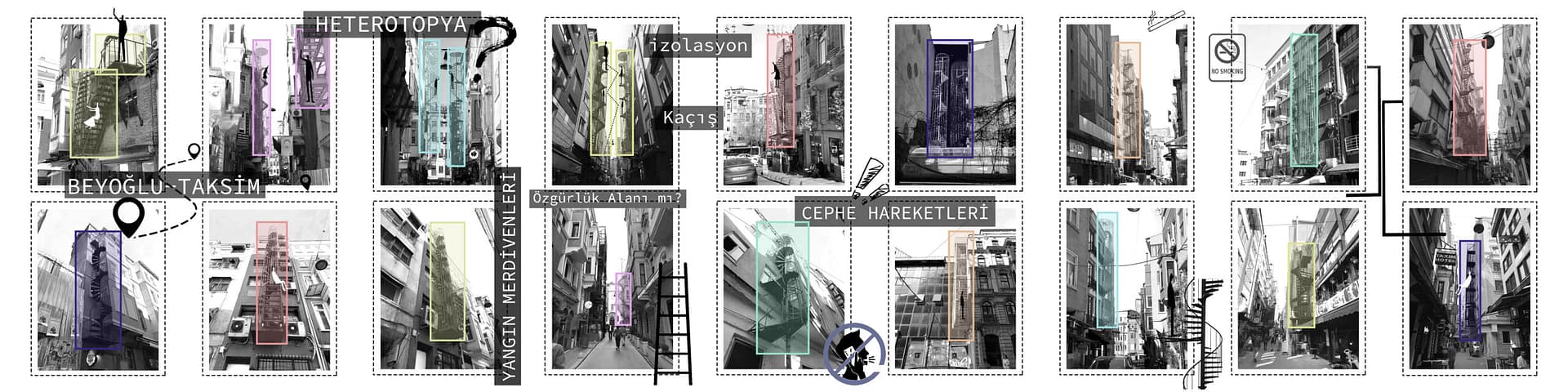 Kent mekânı yalnızca fiziksel yapılarla değil, toplumsal ilişkiler ve tarihsel süreçlerle de şekillenir. Bu yapılar arasında zamanla görünmezleşen, işlevsel ama göz ardı edilen unsurlar da vardır. Yangın merdivenleri, bu “görünmeyen” mimari ögelerden biridir. Bu proje, İstanbul Beyoğlu’ndaki yangın merdivenlerini Michel Foucault’nun heterotopya kavramı çerçevesinde ele alarak, onları yalnızca güvenlik amaçlı değil, alternatif zaman, deneyim ve üretkenlik alanları olarak yeniden düşünmeyi hedeflemektedir.