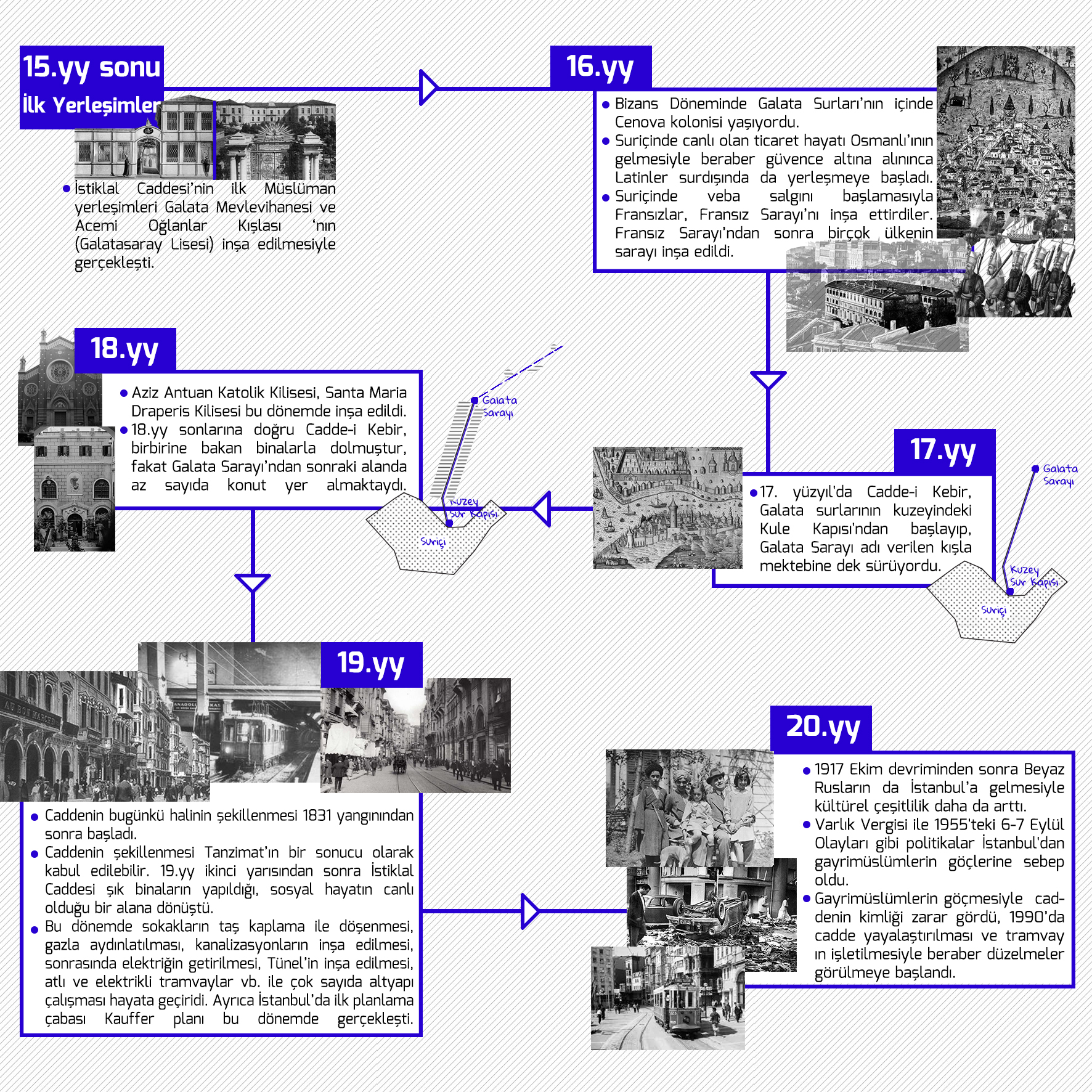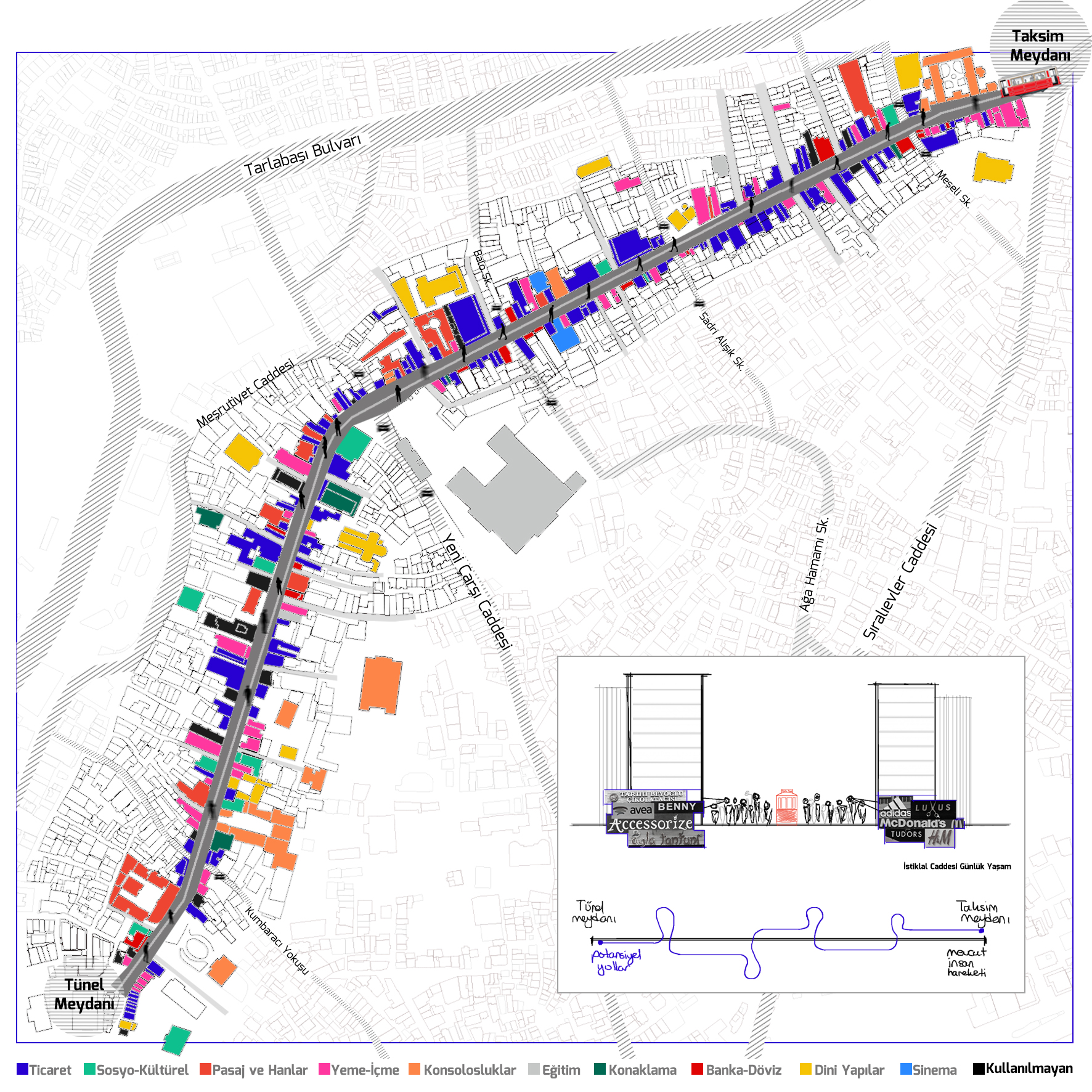 Çalışma alanı olarak İstiklal Caddesi seçilmiş ve yer üretme potansiyelleri mekânla ilişkili olarak sorgulanmıştır. İstiklal Caddesi hem tarihi katmanlarıyla hem de farklı işlevleri olan birçok mekâna sahip olması sebebiyle birçok deneyim için potansiyel bir alan haline gelir. Bu potansiyeller sorgulanırken deneyimler tarih deneyimleri ve günlük deneyimler olmak üzere kategorize edilmiştir. Bu bağlamda mekânı daha iyi anlamak adına caddenin tarih içinde geçirdiği dönüşümler incelenmiş, eski gazete arşivlerinden yaşanan olaylar için belge toplanmıştır. Ardından günümüzdeki ilişkiler incelenip zemin kat kullanım analizi yapılmıştır.