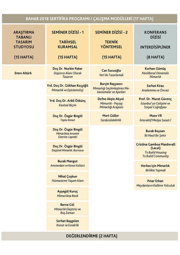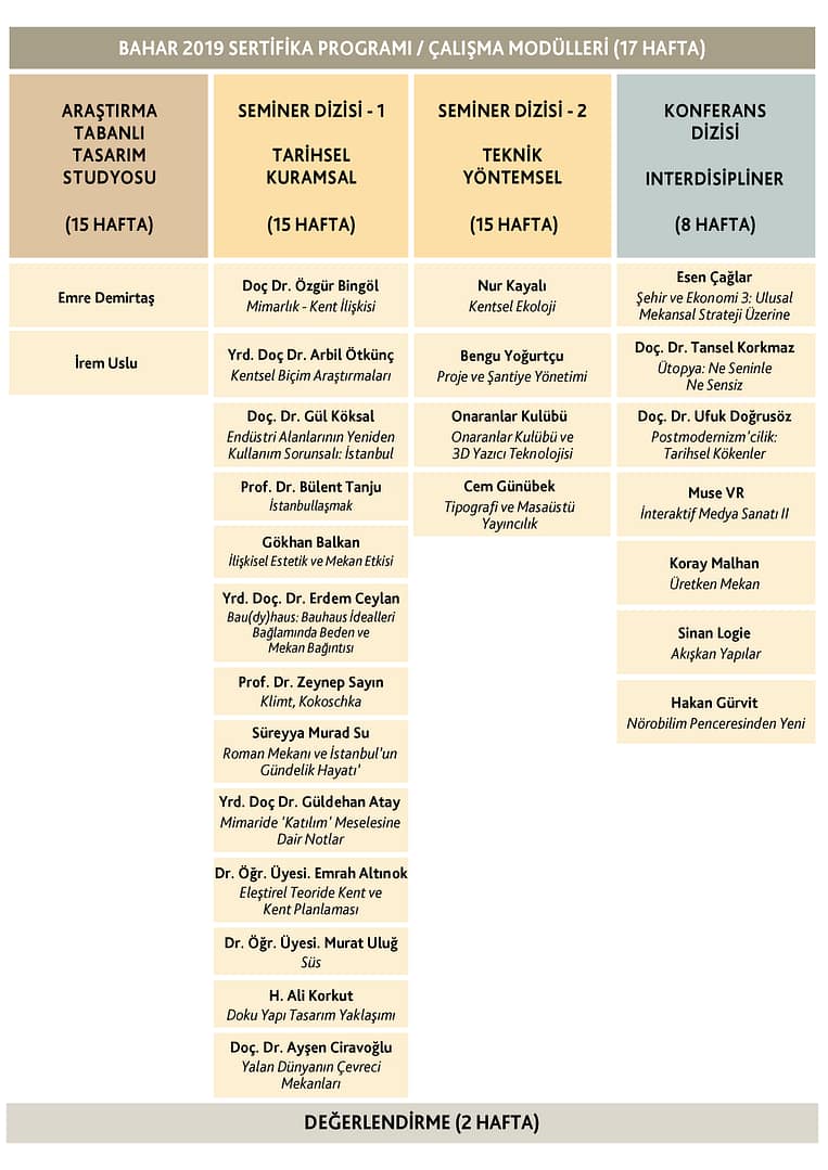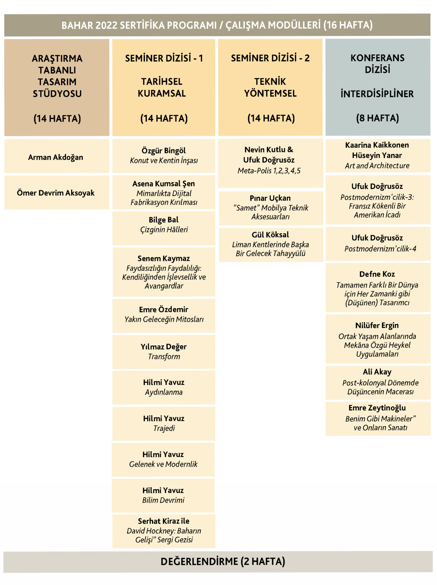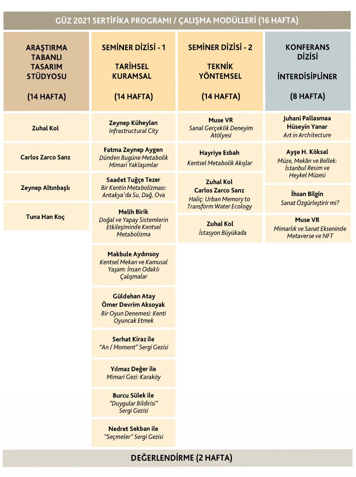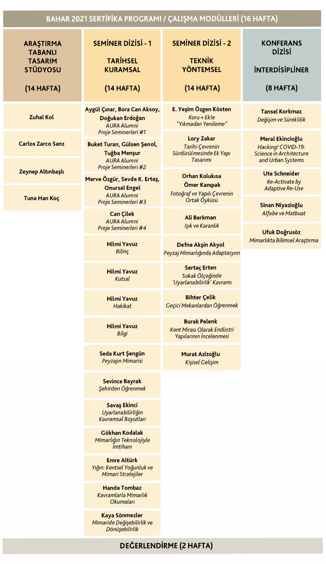 14 haftalık program sürecini, 2 hafta süren, Araştırma Tabanlı Tasarım Stüdyosu’nda gerçekleştirilen üretimlerin AURA İstanbul yayınına yönelik hazırlığı takip eder. 16 haftalık Sertifika Programı, araştırma/tasarım projelerinin teslimi ile sonlanır.
