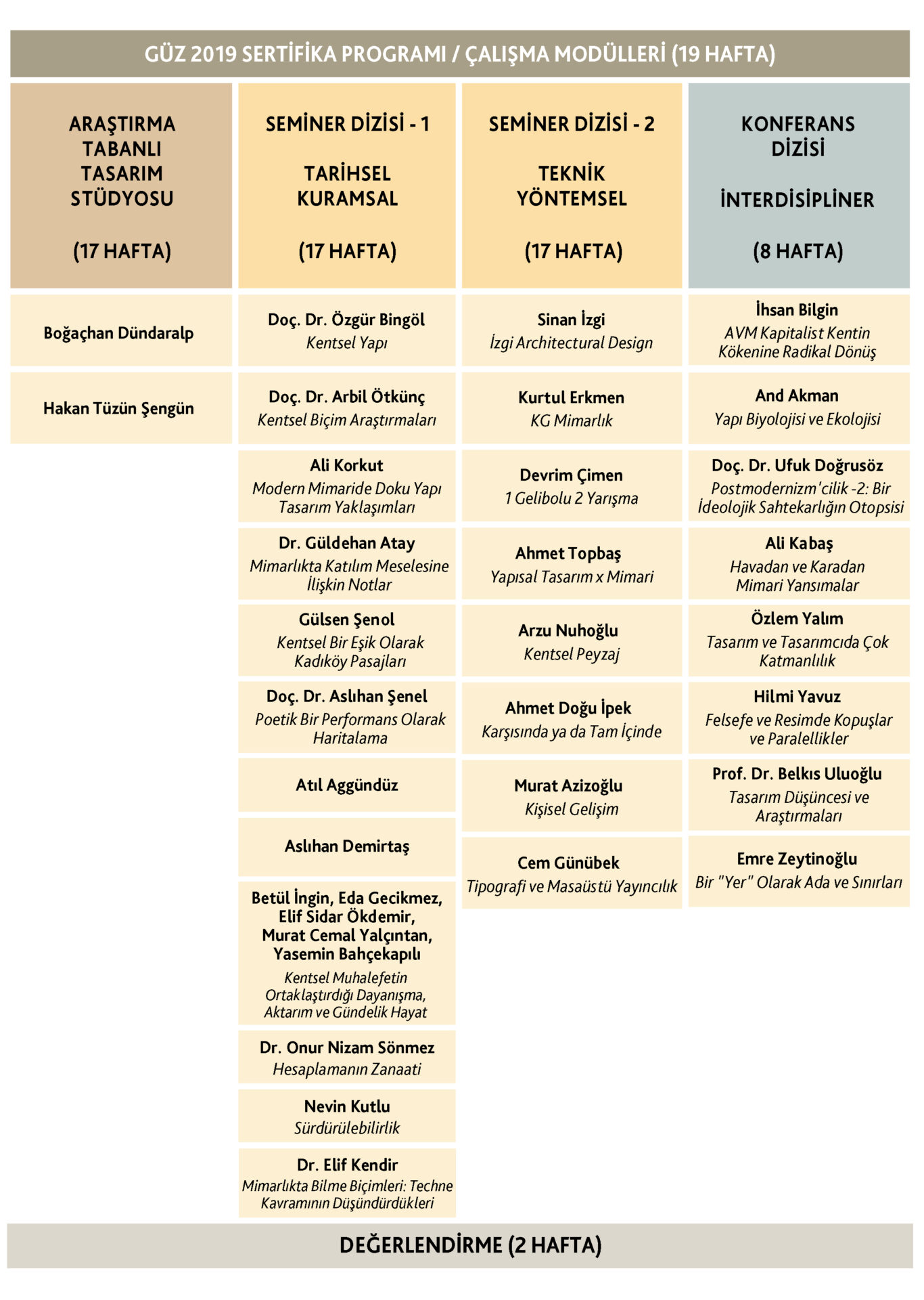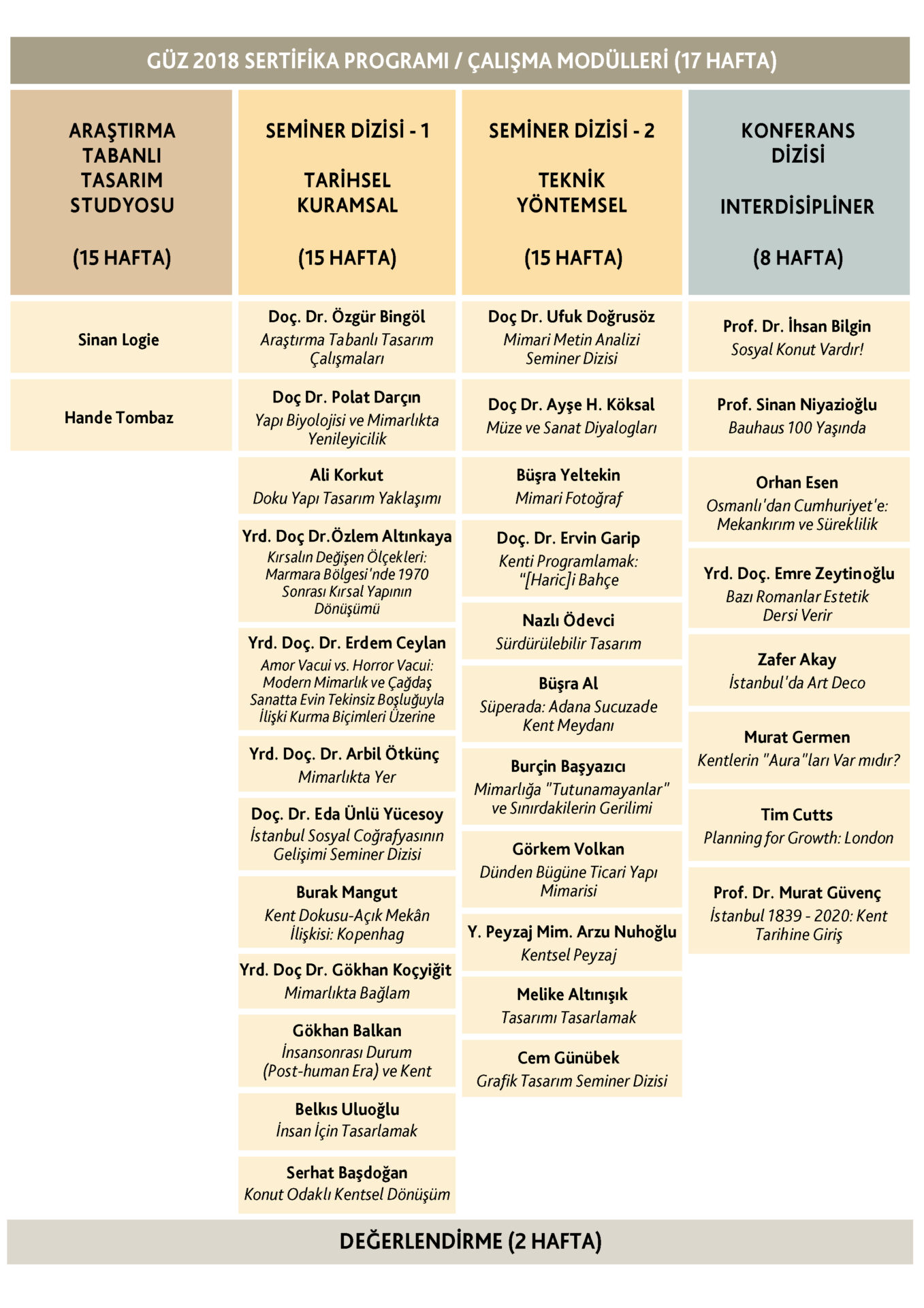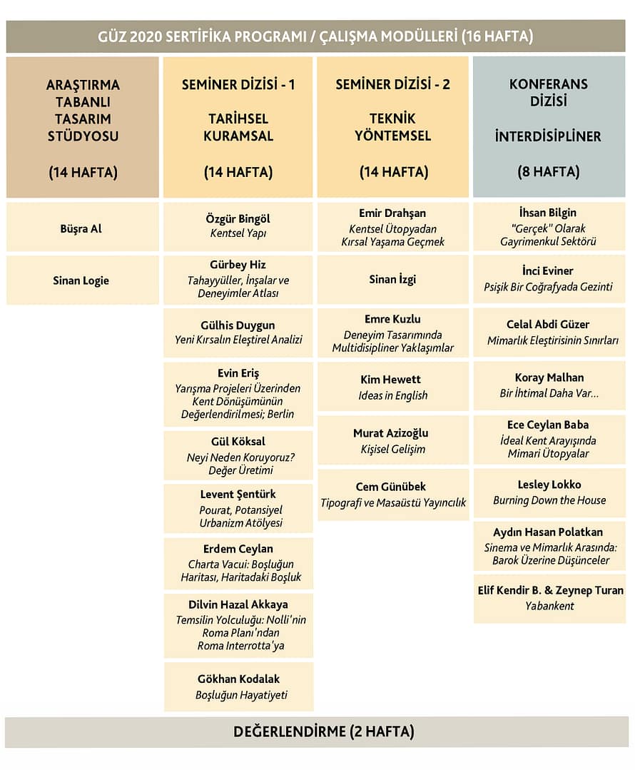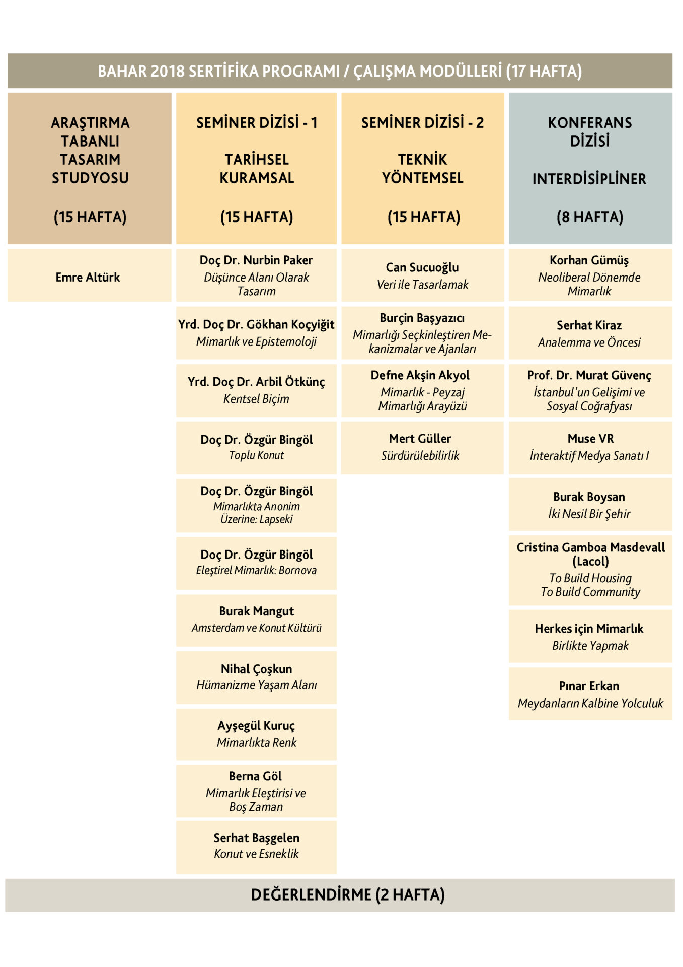 14 haftalık program sürecini, 2 hafta süren, Araştırma Tabanlı Tasarım Stüdyosu’nda gerçekleştirilen üretimlerin AURA İstanbul yayınına yönelik hazırlığı takip eder. 16 haftalık Sertifika Programı, araştırma/tasarım projelerinin teslimi ile sonlanır.