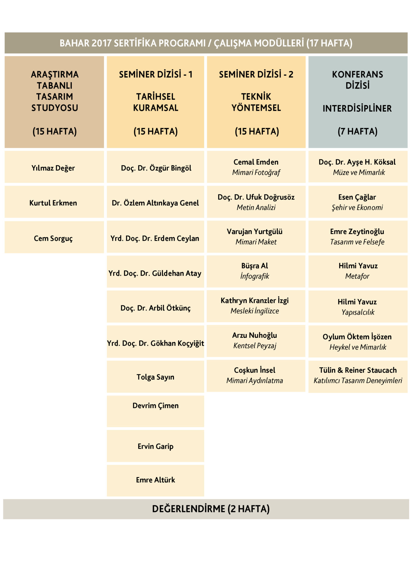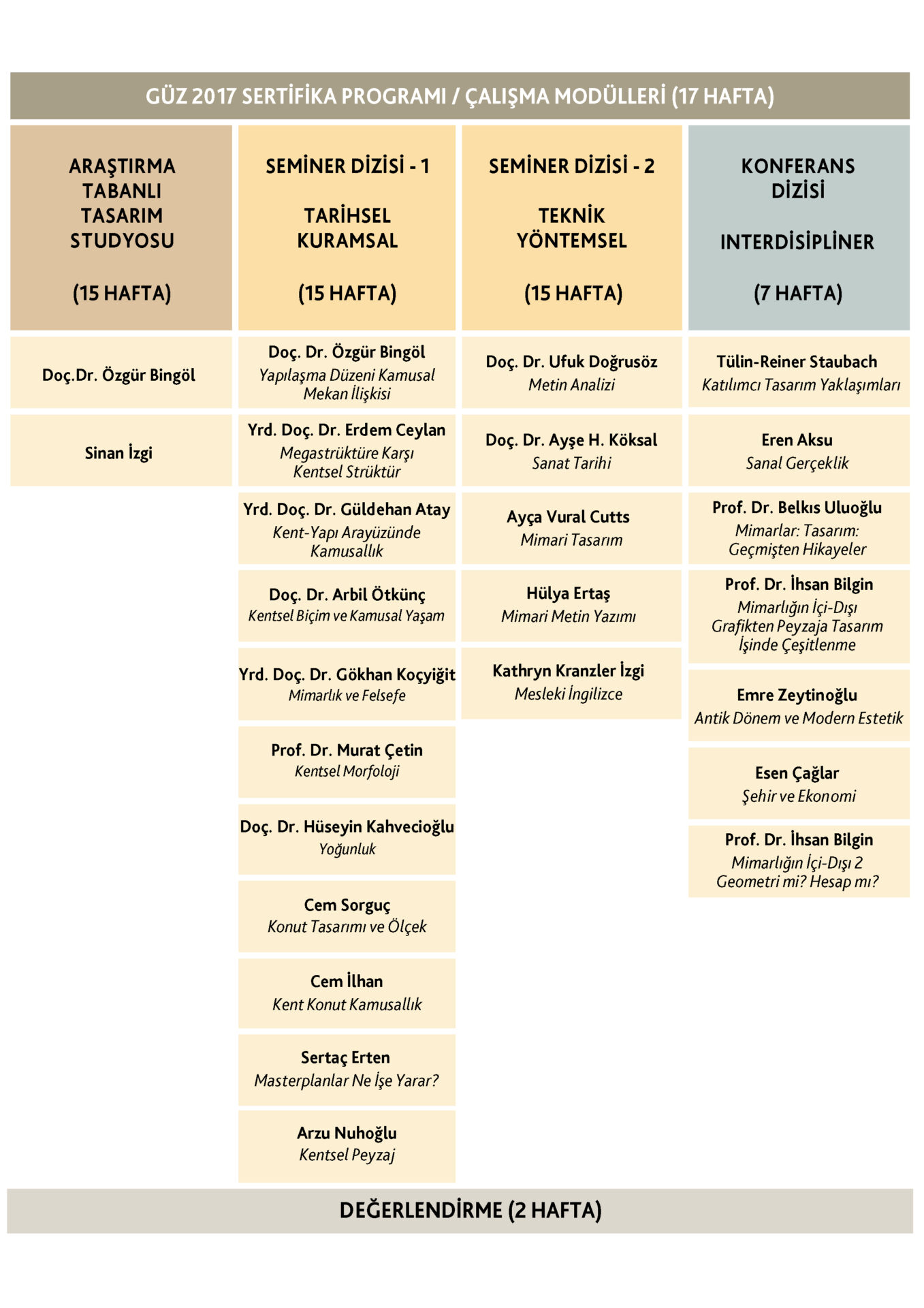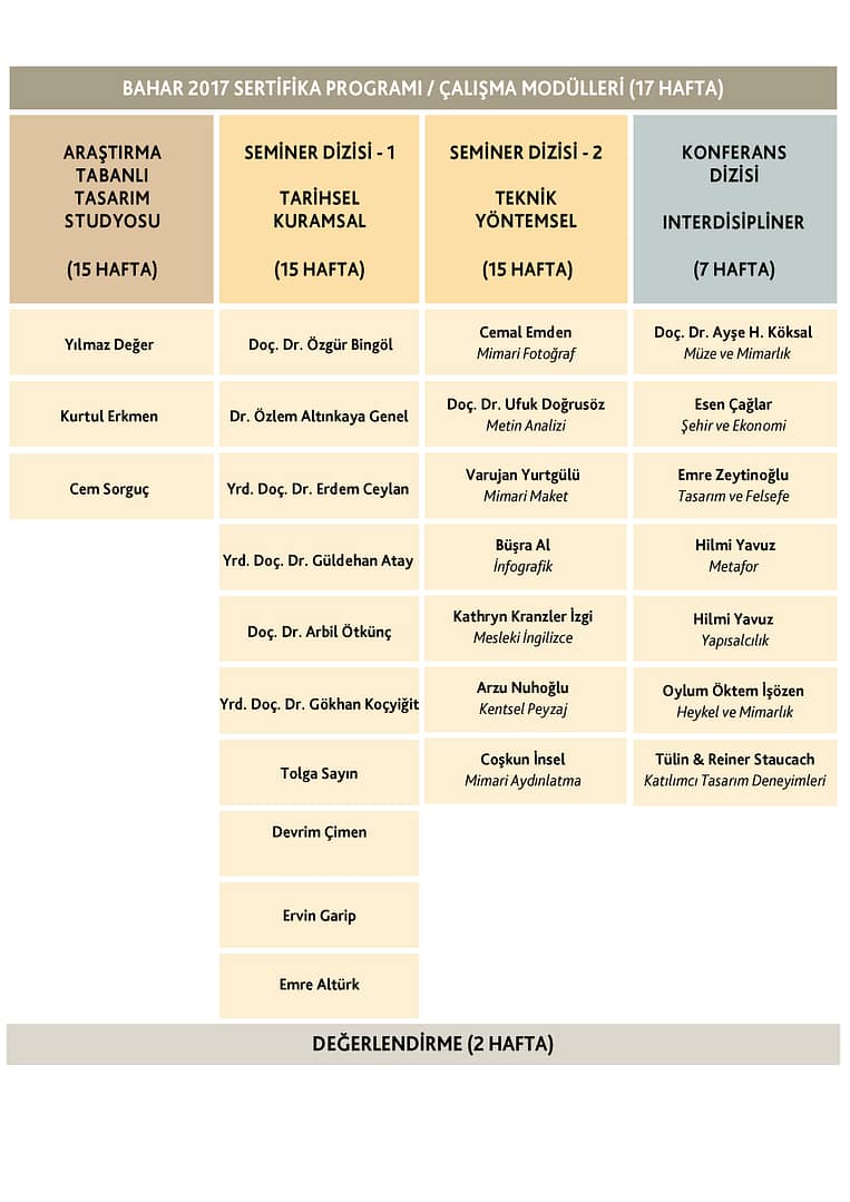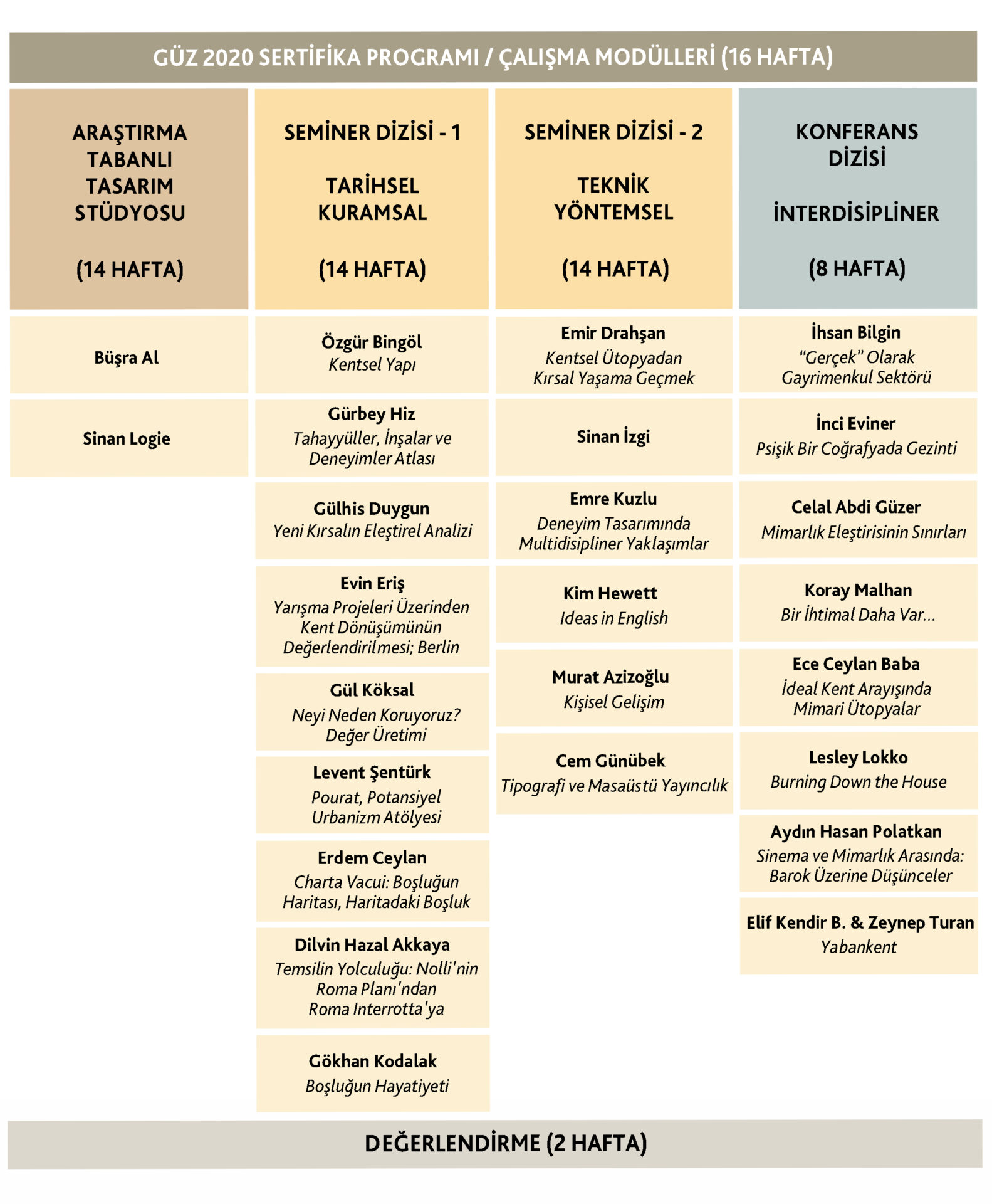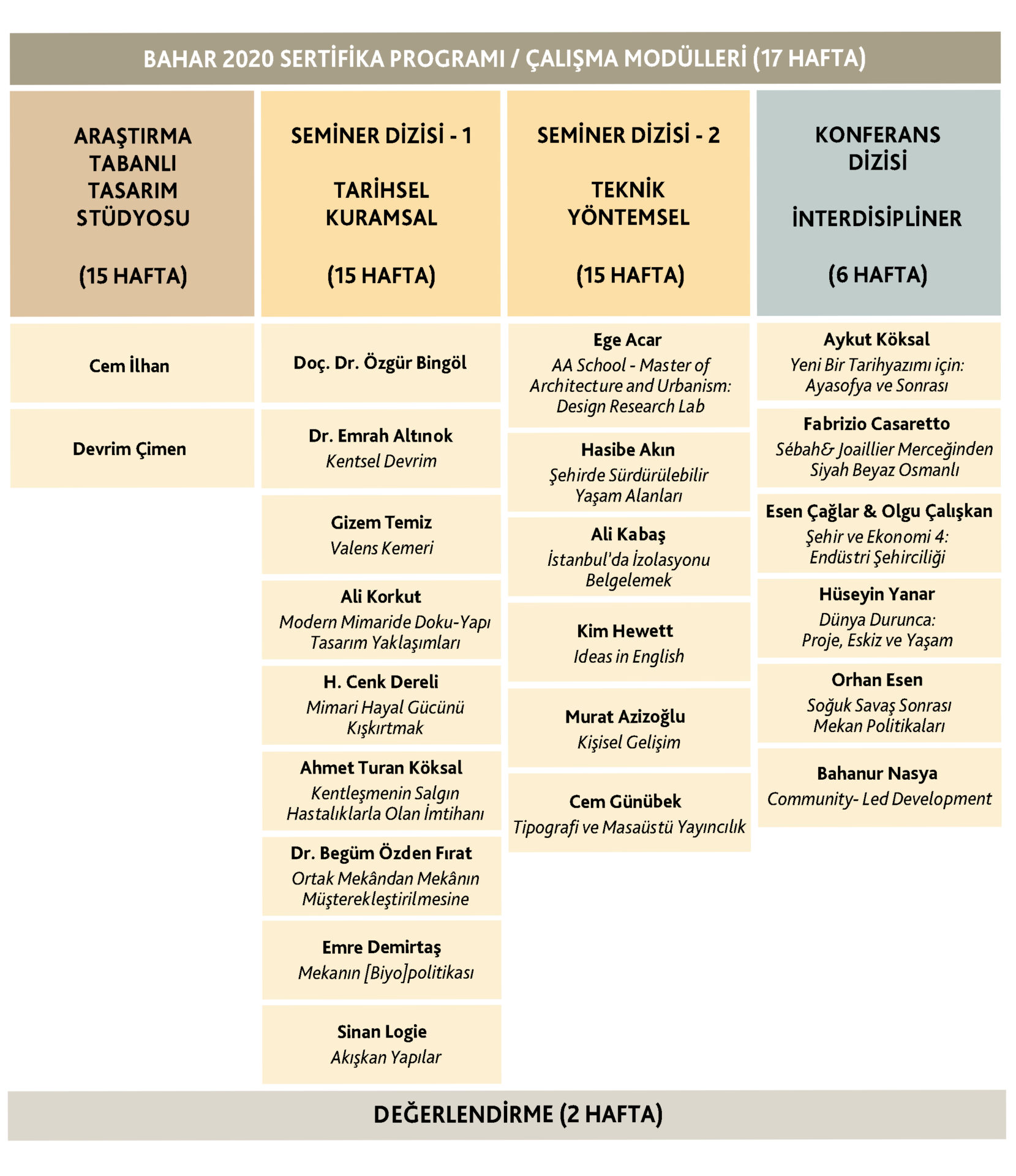 14 haftalık program sürecini, 2 hafta süren, Araştırma Tabanlı Tasarım Stüdyosu’nda gerçekleştirilen üretimlerin AURA İstanbul yayınına yönelik hazırlığı takip eder. 16 haftalık Sertifika Programı, araştırma/tasarım projelerinin teslimi ile sonlanır.